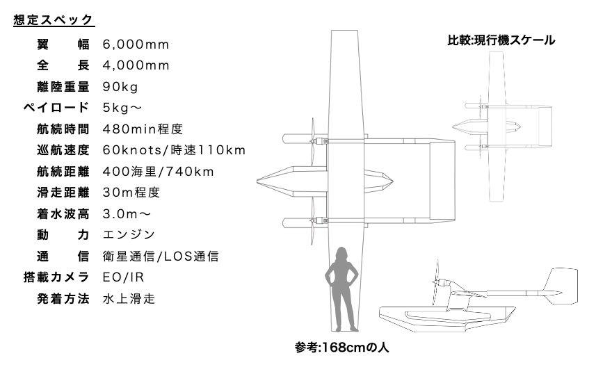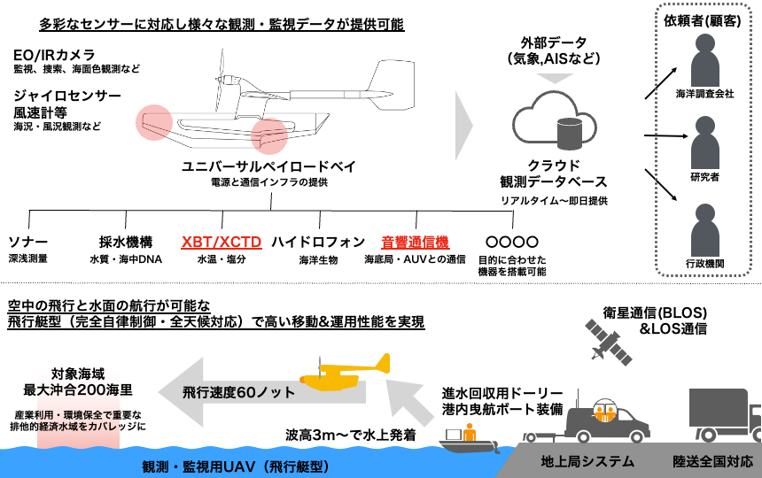水上で発着でき、船のようにも航行できる「HAMADORI 6000」は、翼幅6mの飛行艇型ドローンです。観測地点の座標を設定し、110km/hで航続時間8時間を目標に開発を進めています。実験当日、最大風速約8m、最高波高約1.5mの相模湾の環境においても、安定した海面保持を実現しました。