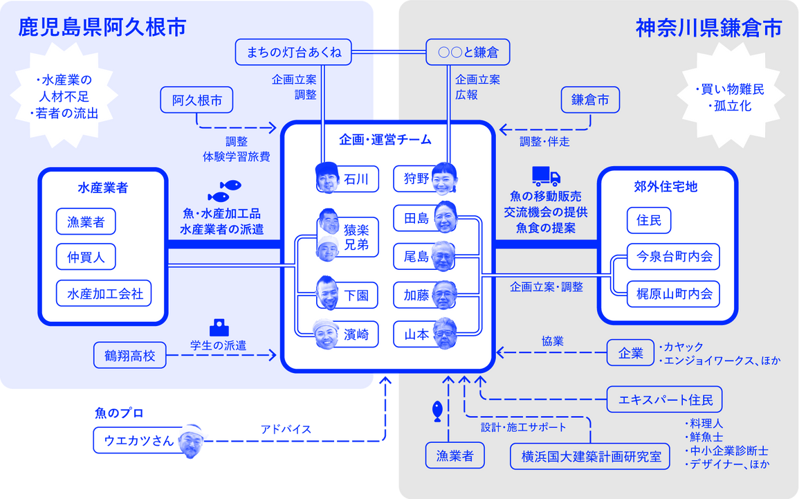 2023年春、鎌倉・今泉台にフラッグシップをオープン予定。地元・鎌倉の漁業者と阿久根の仲買人から直接仕入れた鮮魚や日替わり惣菜、加工品等を、店舗だけでなく鎌倉市内各所で移動販売します。魚をテーマにしたワークショップや生産者との交流イベントなども企画中です。