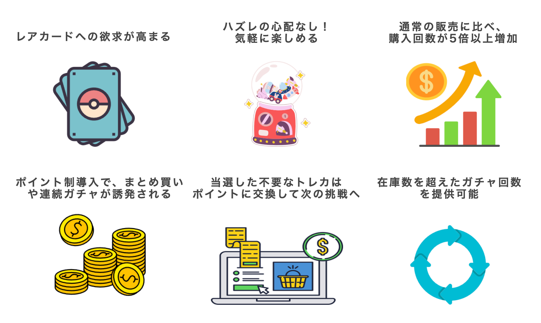 当システムを活用して、トレカを賞品とするガチャを展開することで、ユーザーの参加数、一人当たりのガチャの回数、そして売上を大幅に増加させることができます。