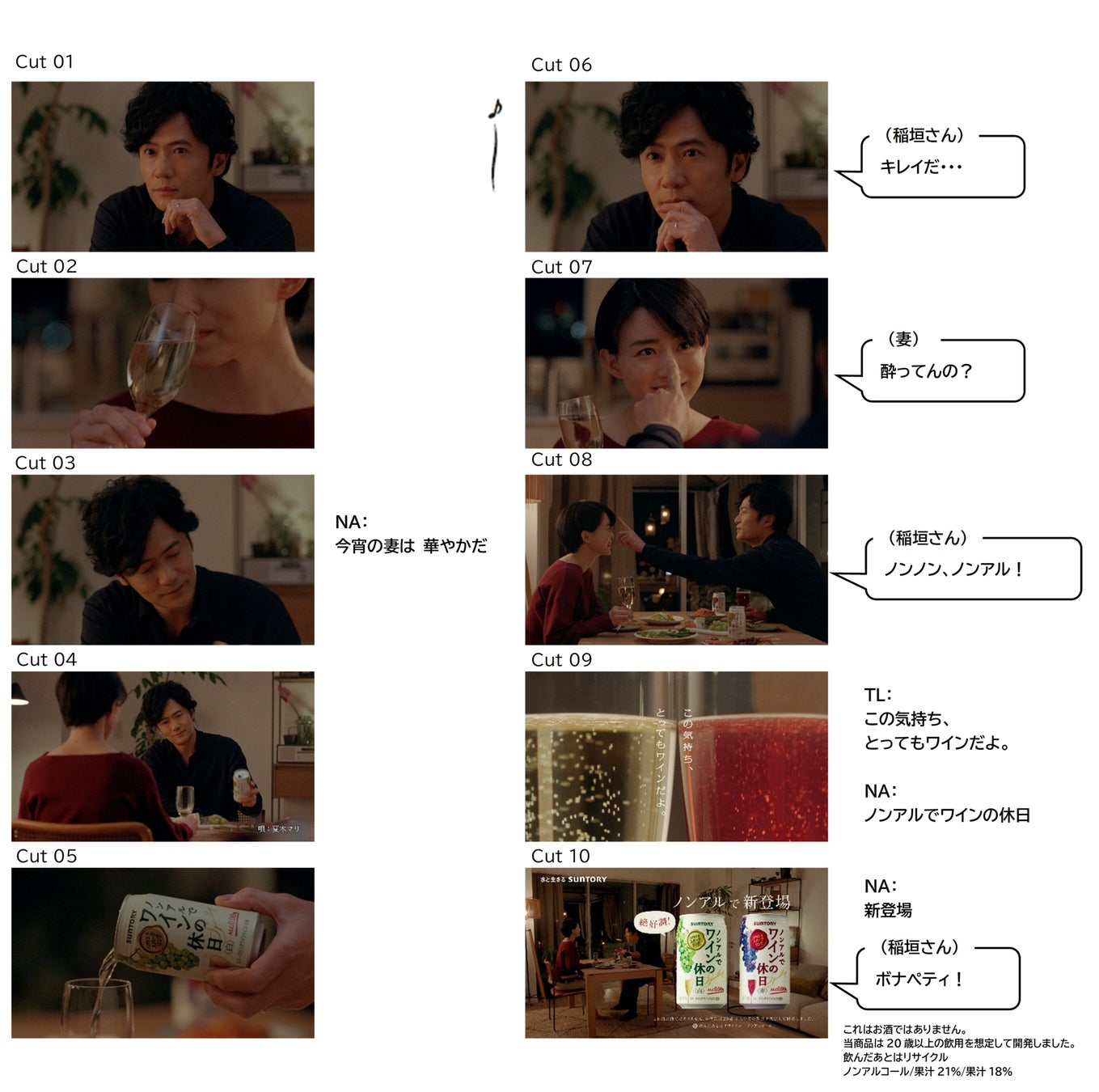 自宅のダイニングで、食事と「ノンアルでワインの休日」を楽しむ夫婦。「今宵の妻は華やかだ」のナレーションとともに、妻を見つめる夫の稲垣さん。ボトルワインを注ぐような動きで「ノンアルでワインの休日」の缶を妻のグラスに注ぎます。ワインの気分と妻の魅力に酔いしれ、「キレイだ」と妻に一言。「酔ってるの?」と返答する妻に、「ノンノン、ノンアル」とお茶目な返しをする稲垣さん。そんな夫婦の特別な時間を過ごす気持ちを表現した「この気持ち、とってもワインだよ」というコピーとともに「ノンアルでワインの休日」が映し出され、最後に食事の感想を会話しながら談笑する夫婦が映し出されます。