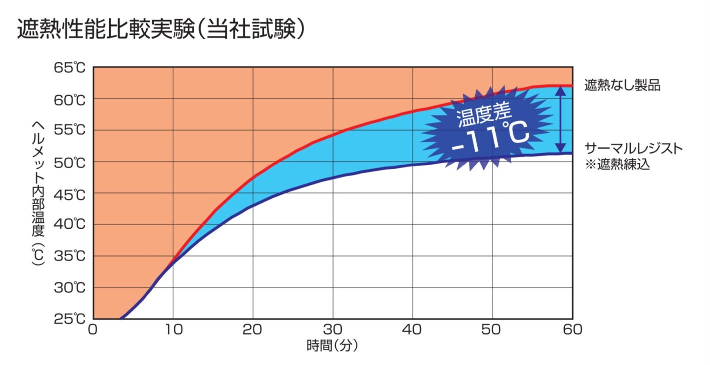 ヘルメットを成型するABS樹脂に特殊な遮熱素材を配合、安全性を確保しながら従来よりもより遮熱性能の高いヘルメットを実現しました。