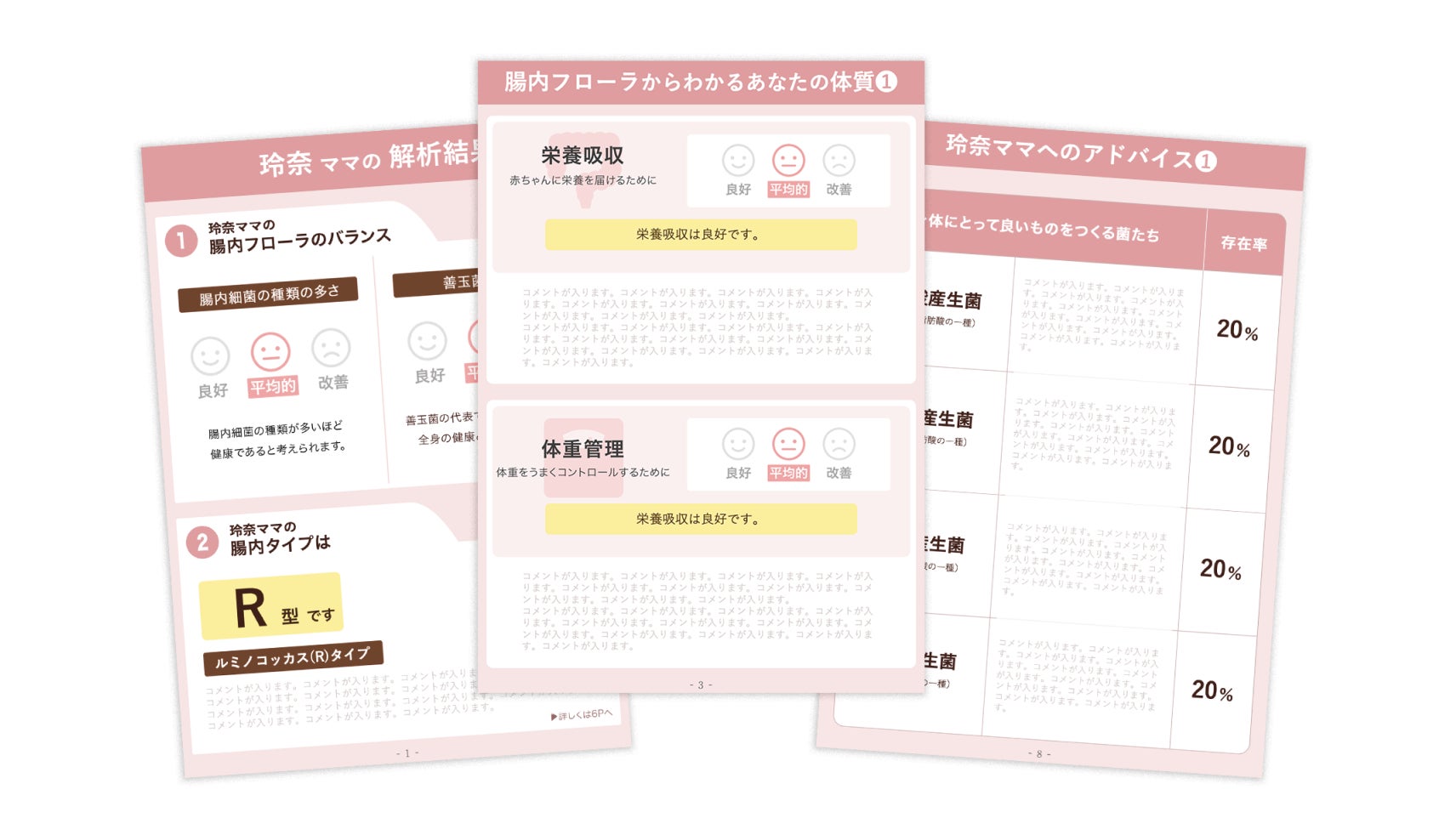 ママフローラは、自宅でできる検査キットを使って、お腹にどのような種類の菌が、どのくらい存在しているのかを調査し、その結果を基に、あなたの腸内細菌に合う食材などが記載されたレポートを作成します。