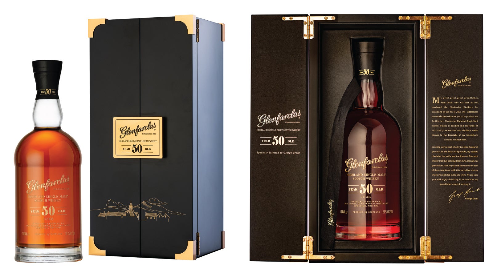 この度、5代目当主ジョン・グラントの蒸留所経営参加50年を記念して、非常に希少な50年熟成のウイスキーをボトリングしました。エッジングが施されたグレンケアン・クリスタル社製のデキャンターが、シックで上品なギフトボックスに収められています。蒸留所の長い伝統が詰まった深い味わいを是非お楽しみください。