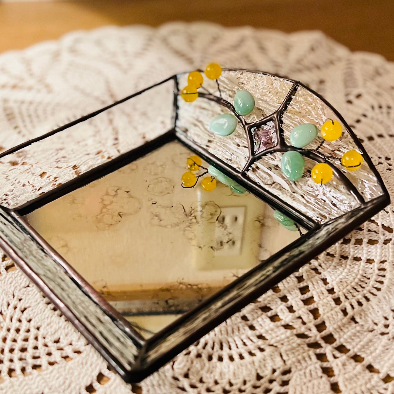 ステンドグラスで制作したミモザのトレイになります。底の部分は、アンティーク風ミラーを使いシックな雰囲気に仕上げました。