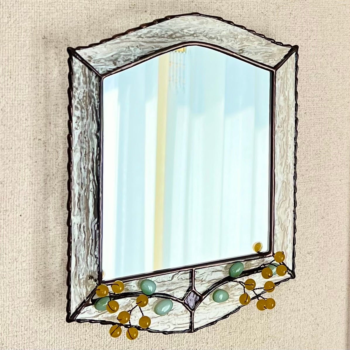 立体的に表現したミモザは、イエローカルセドニー(天然石)と葉のグリーンガラスを銅線で組み立てた物を鏡の上に装飾しました。