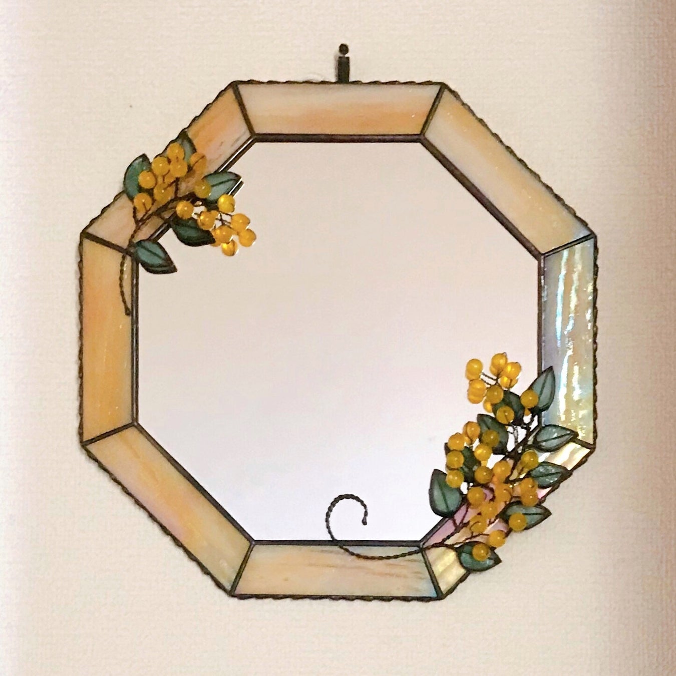 ステンドグラスで制作した春の代表的な花、ミモザの八角形鏡になります。