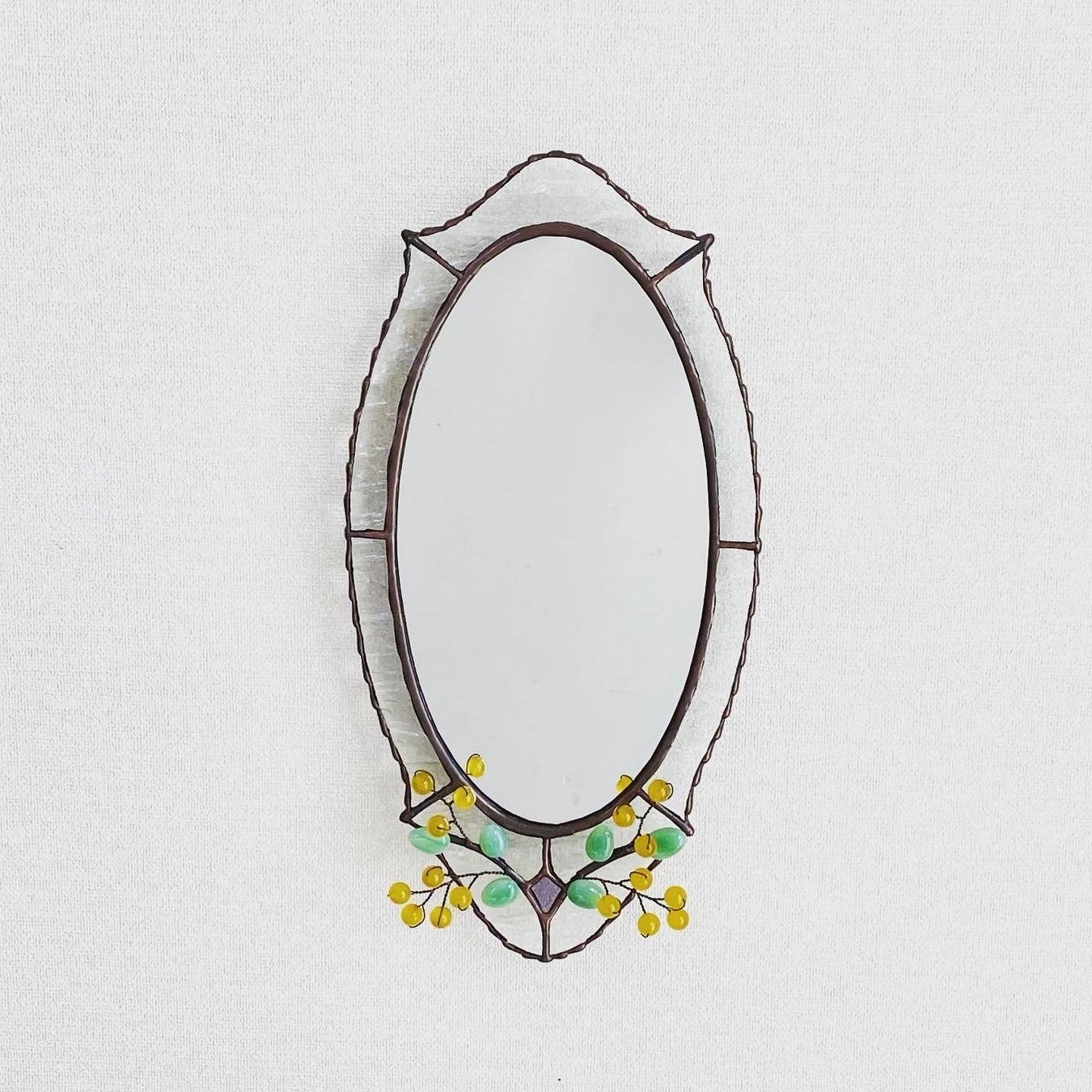 ステンドグラスで制作したミモザのアンティーク調のミラーになります。