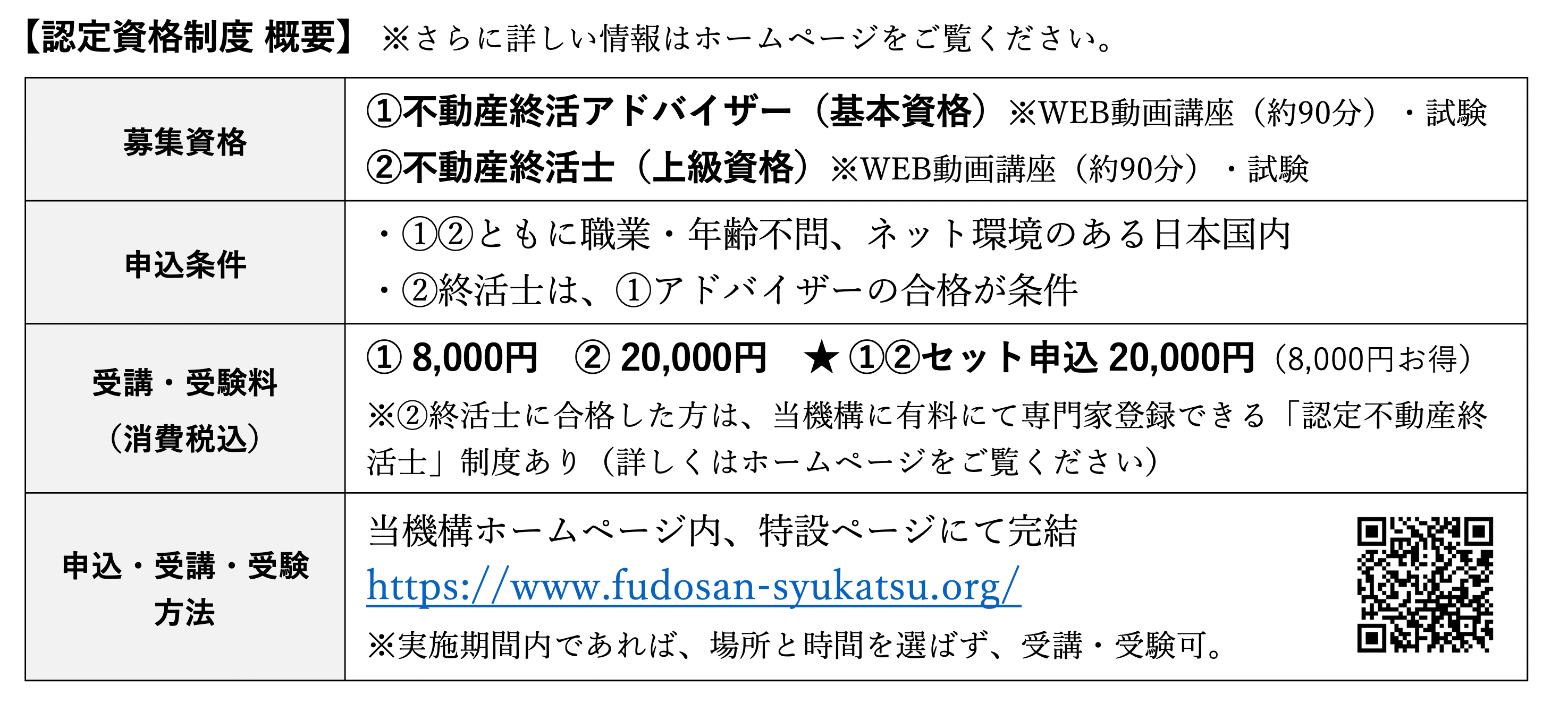 一般社団法人 不動産終活支援機構(代表理事:齊藤 正志)は、提唱する「不動産終活」の普及へ向けた新たな取り組みとして、「不動産終活アドバイザー」 「不動産終活士」 2つの認定資格を創設し、1月10日(火)より資格取得のための受講・受験の申込受付を当機構のホームページ( https://www.fudosan-syukatsu.org/ )で開始しました。