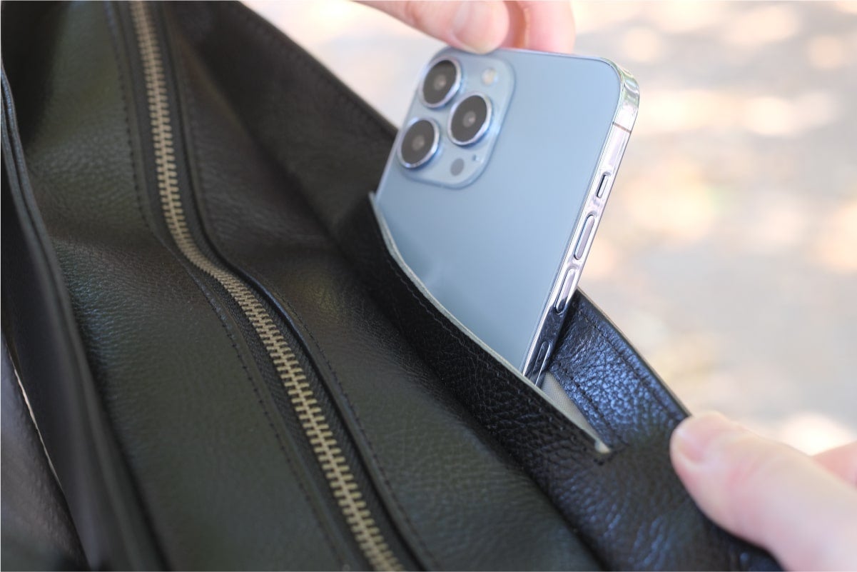 スマホや名刺、財布もストレスフリーに出し入れ。特殊設計のスマートフォンポケットがあるので、必要なものがストレスフリーに出し入れできます。