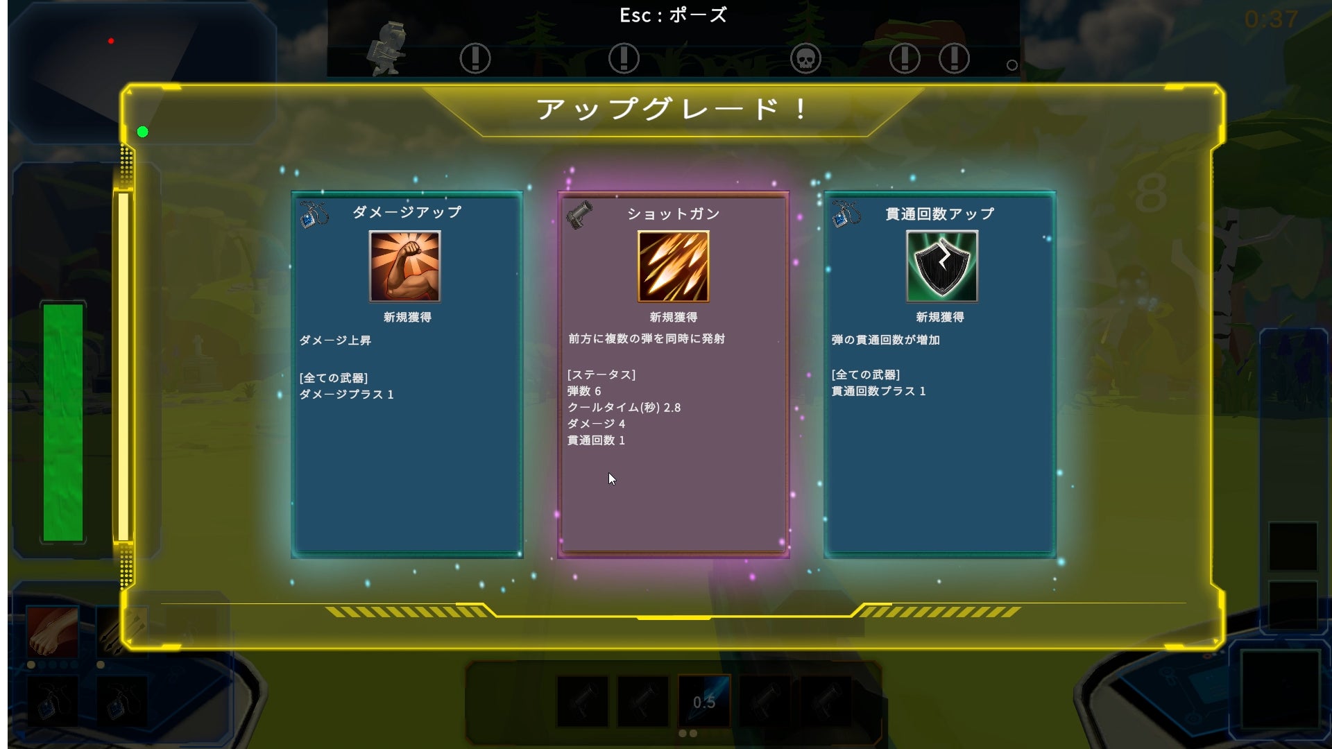 敵を倒すと経験値を取得し、経験値ゲージがマックスになる度に、獲得(強化)する装備を1つ選択できます。装備の相性や組み合わせによって戦闘能力は変化するため、プレイヤー独自のプレイスタイルで遊ぶことが出来ます。また、まれに出現するアイテムは非常に強力で、使用するタイミングで戦況を覆すことも可能です。