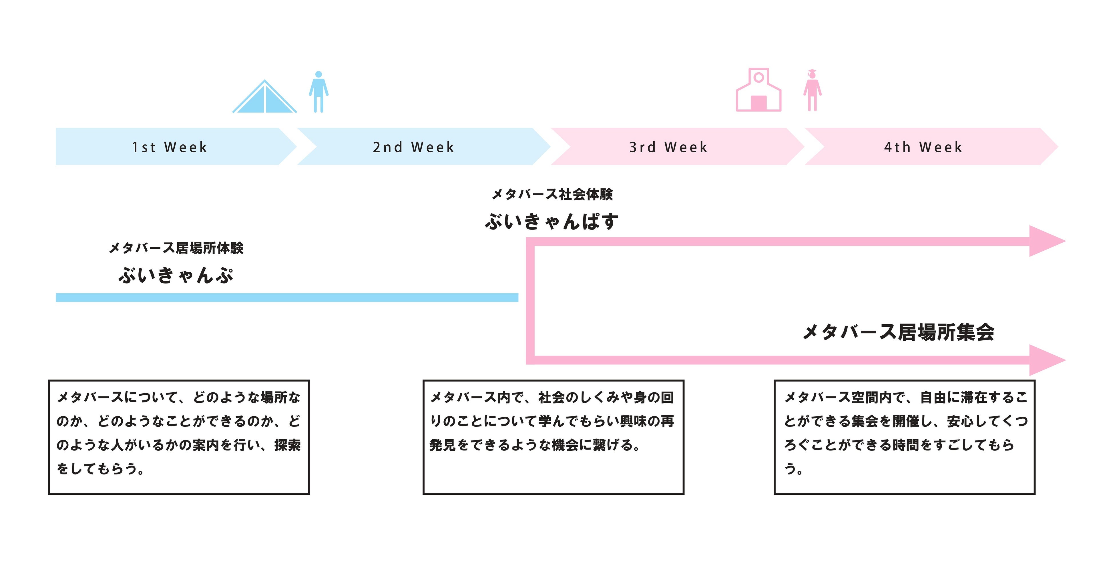 不登校学生に対しての”居場所支援”を目的としており、参加者にメタバース空間ならではの様々な体験を提供します。期間中は、専門家による勉強会に参加したサポーターが参加者のメタバース内での活動を補助します。
