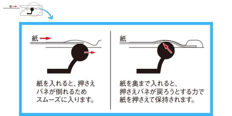新機構の樹脂製抑えばねを開発し、ワンタッチでの紙の抜き差しが実現しました。コピー用紙であれば一度に1~5枚保持することができ、金属パーツを使用しないため掲示物へのダメージが軽減されています。