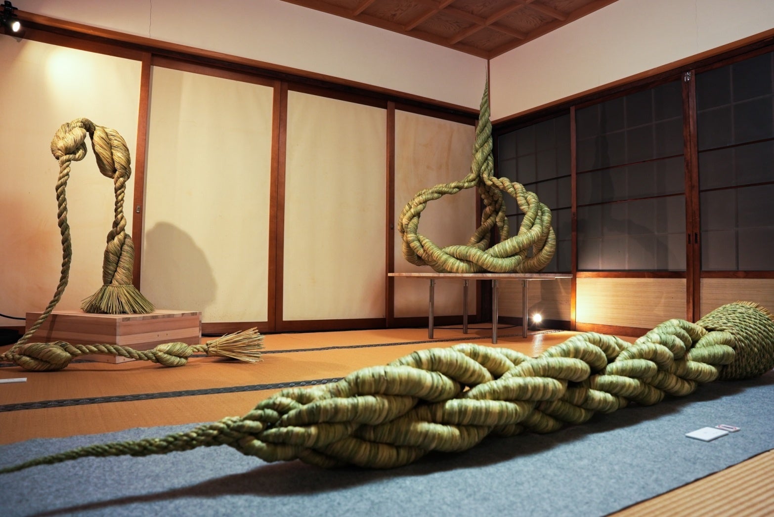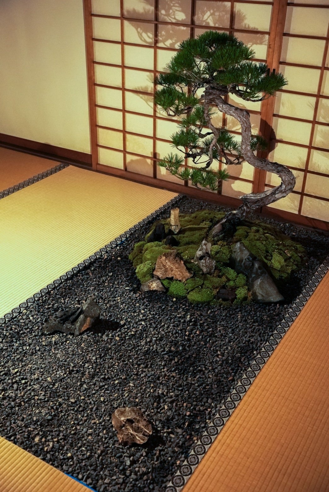 現役庭師ユニット「植司」がお寺の一室を庭に作り替えた観葉植物ならぬ室内で愛でる庭。フランスで年2回開催されるプルミエール・ヴィジョン・パリにパートナー企業のKYOTO Leatherのプロジェクトとして2016年以降出展しつづけている。西陣の引箔職人で作家の西山大介。直系の本阿弥十五代を祖父に持つガラス彫刻・生活工芸作家の本阿弥匠など、伝統とアートを掛け合わせたさまざまな領域の境界で表現を行う作家の作品を鑑賞できる。