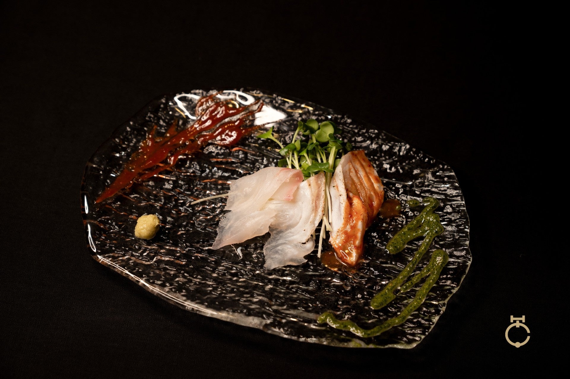 天然真鯛に下味をつけ、刺身・炙り・コチュジャン焼きを並べてご提供します。