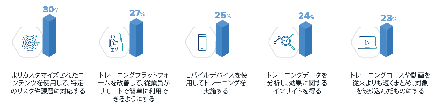 日本のプログラムでは、社内システムなどの要因が、プログラムの有効性や効果の向上を妨げていると報告されています。また社内システムの強化の必要性とともに、日本のプログラムにおけるトレーニング改善の優先事項として、トレーニングプラットフォームの強化や特定のリスクに対応するカスタムコンテンツの充実があげられました。