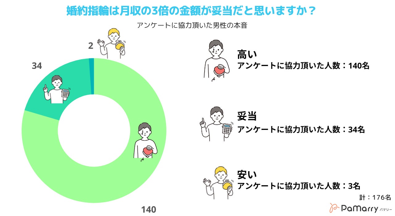 本記事では、令和に結婚(令和婚)でも「婚約指輪の月収の3倍相当の金額が妥当か?」男性176名を対象にアンケート調査を実施いたしました。
