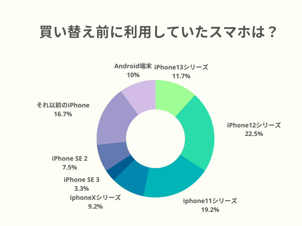 iPhone13シリーズ(11.7%)、iPhone12シリーズ(22.5%)、iPhone11シリーズ(19.2%)、iPhoneXシリーズ(9.2%)、iPhone SE 3(3.3%)、iPhone SE 2(7.5%)、それ以前のiPhone(16.7%)、Android端末(10%)という結果になりました。