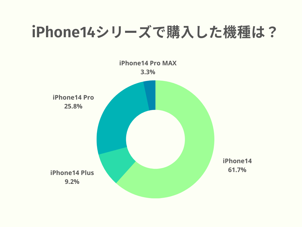 iPhone14(61.7%)、iPhone14 Plus(9.2%)、iPhone14 Pro(25.8%)、iPhone14 Pro Max(3.3%)という結果になりました。