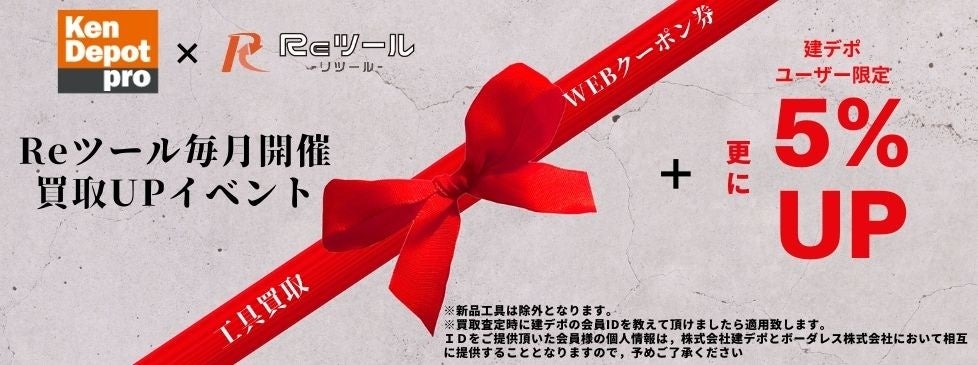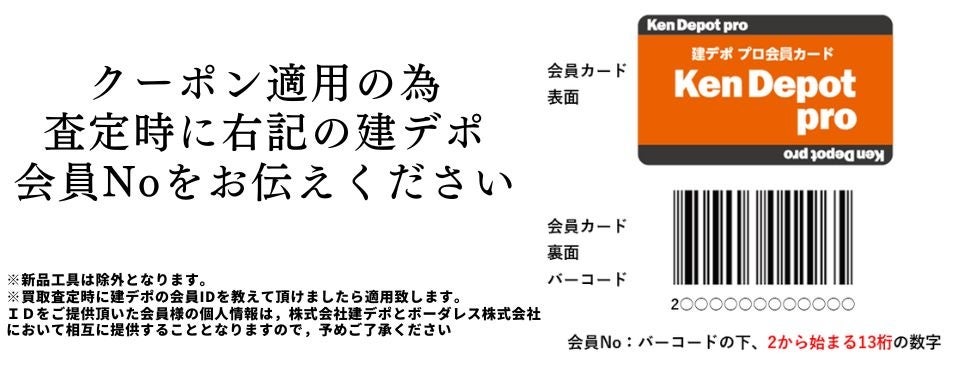 イベント内容:建デポの会員に限り査定時に会員番号を伝えて頂くと中古工具の買取価格を5%アップする。(新品未使用品を除く)