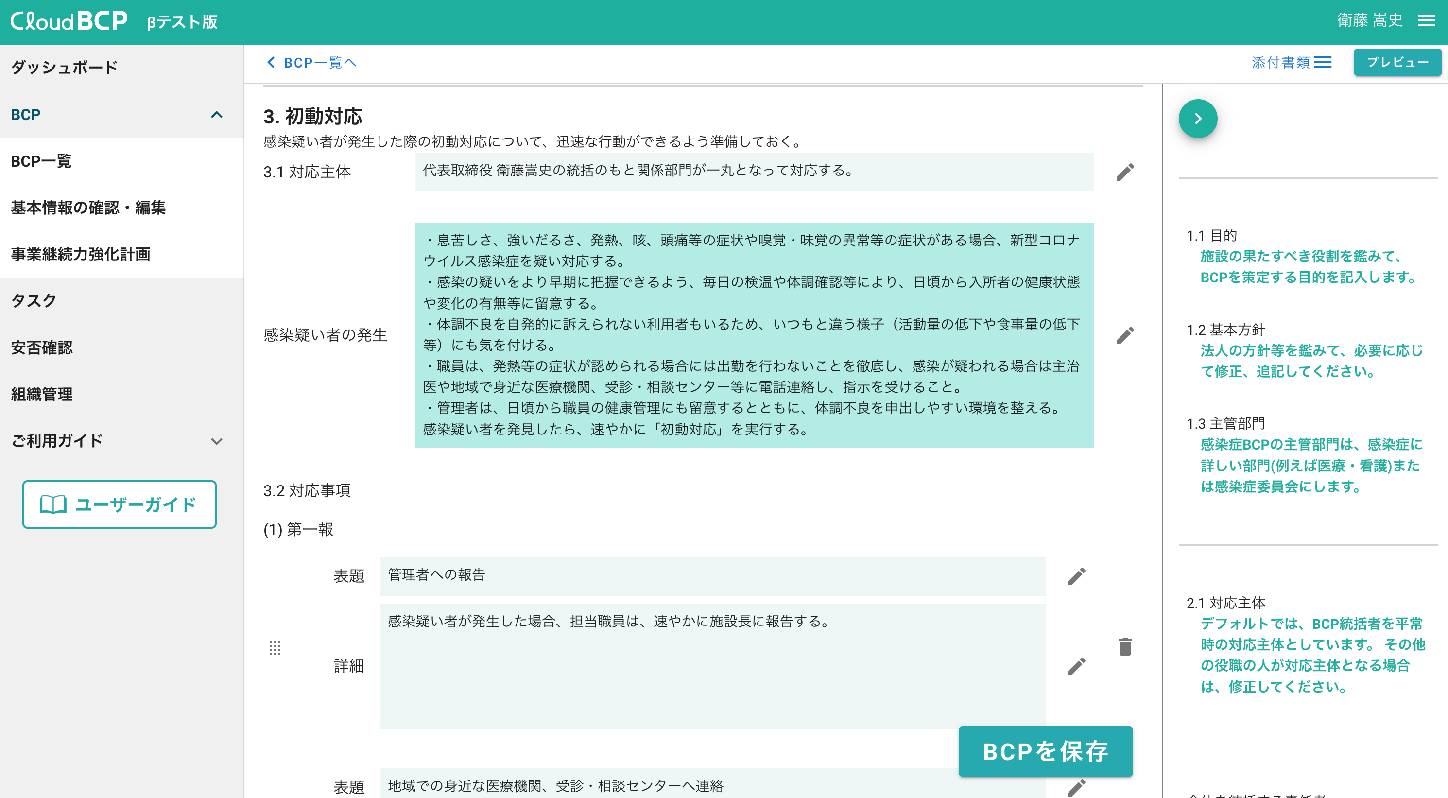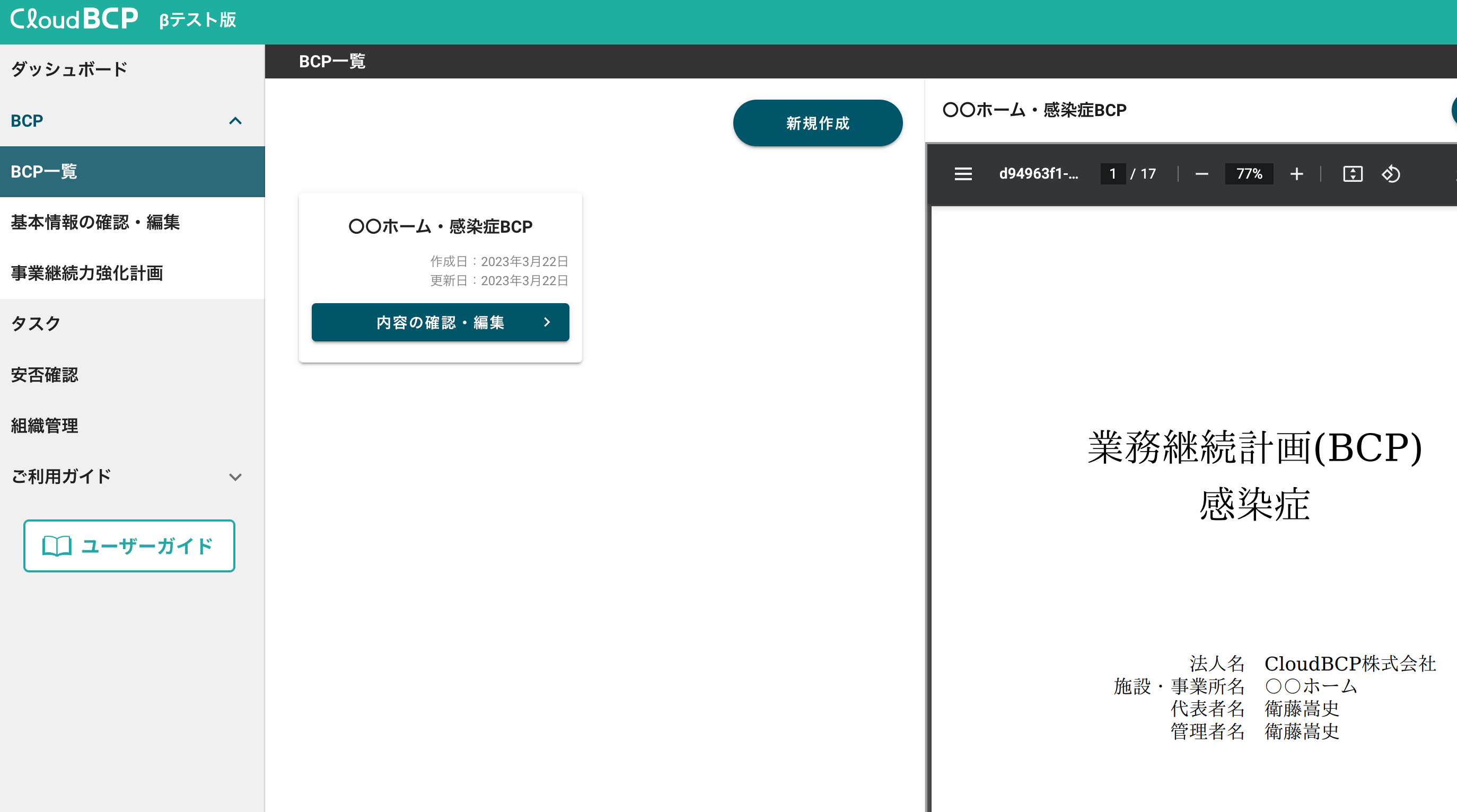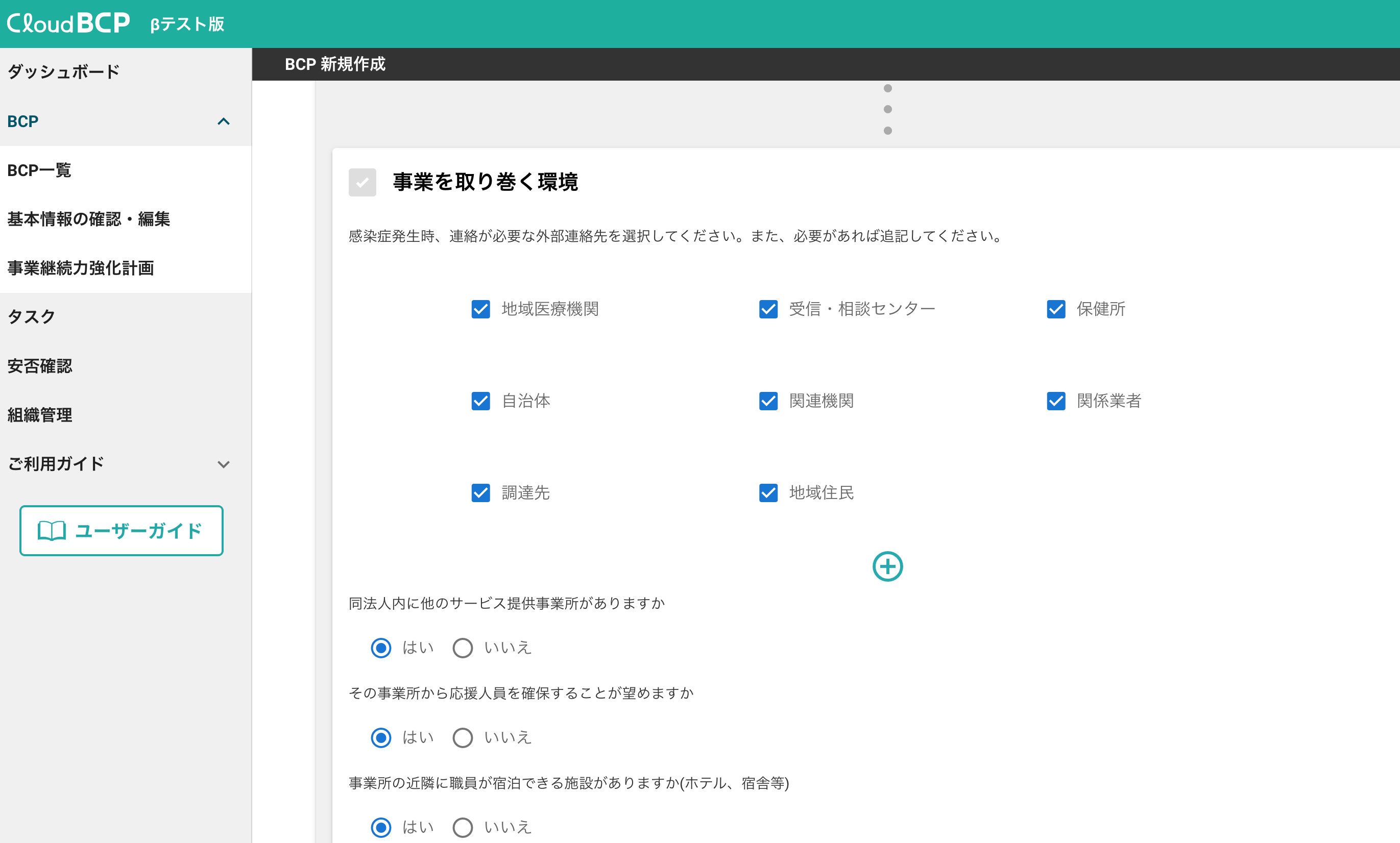 CloudBCPは、2023年3月20日、介護事業者向けBCP策定機能のベータ版として、入居・入所系介護事業所の感染症向けBCP策定機能をリリースしました。