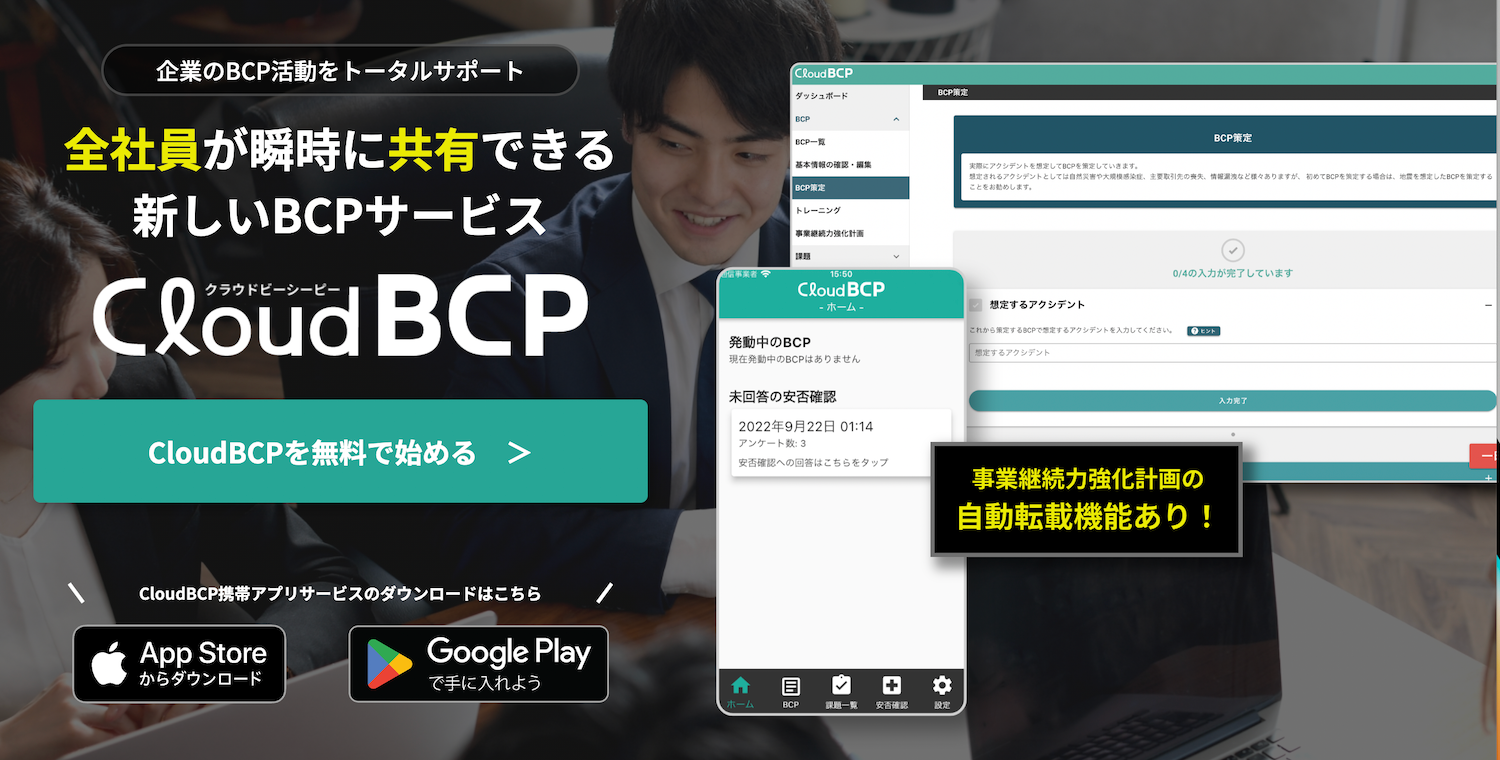 CloudBCPはBCP(事業継続計画)・BCM(事業継続マネジメント)を簡単にし、机上の空論にとどまらず実際に活用できるBCP活動を行えるよう、経営者をサポートしています。