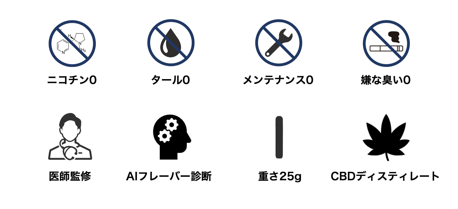 そして、上記4つのポイントをクリアした、これまでにない、QOLを高めるプロダクトとして、化学(CBD)と医師の知見(深呼吸)、テクノロジー(AI)を融合させた新発想の深呼吸デバイスを開発致しました。