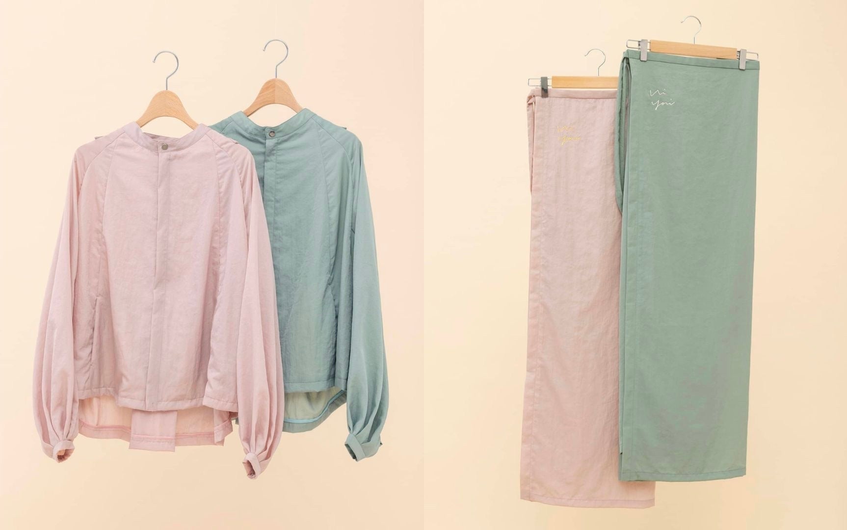 二部式構造のEMOUは、セットアップはもちろん、ジャケットまたは裾よけ単品の着用も可能です。
