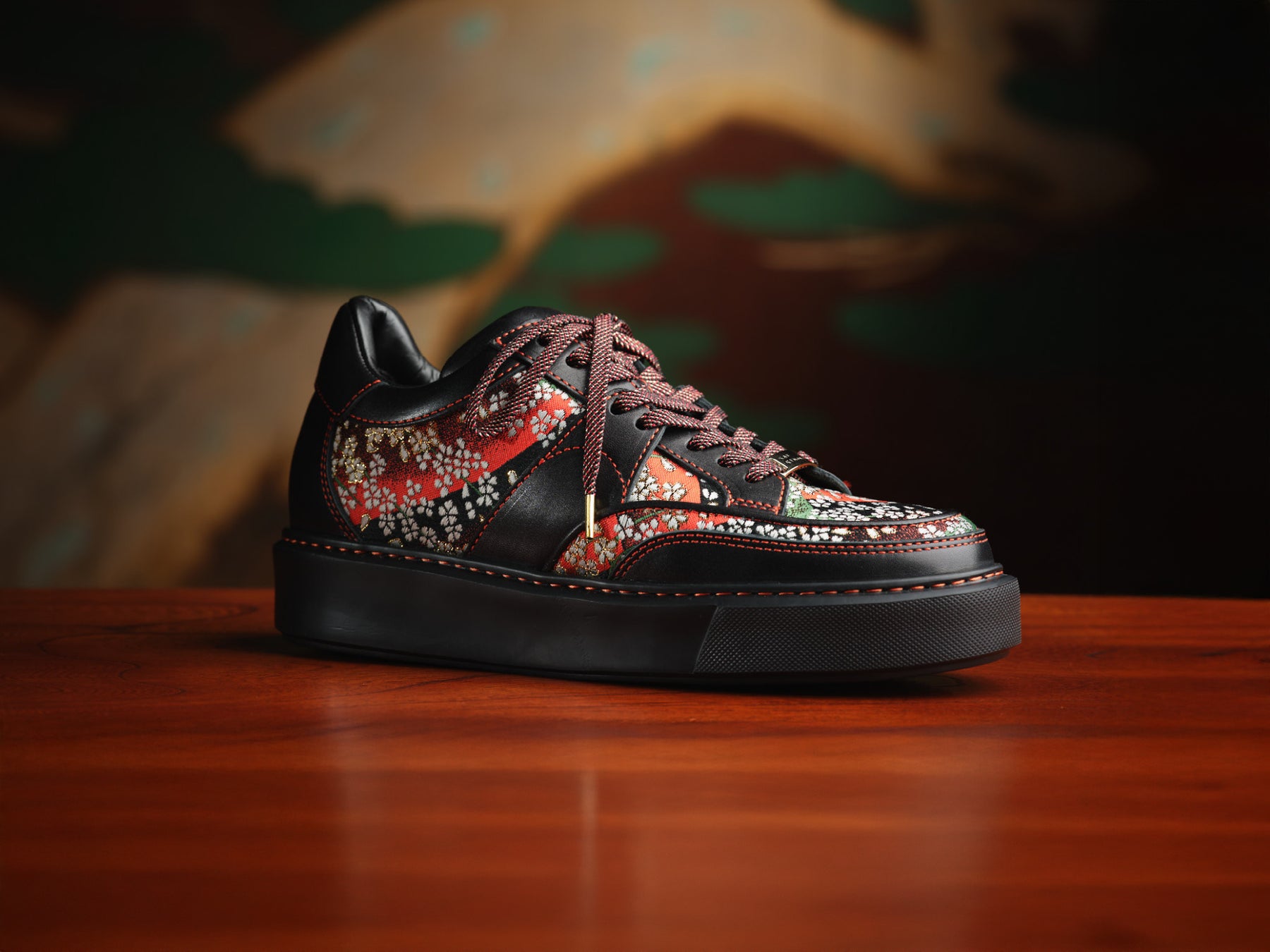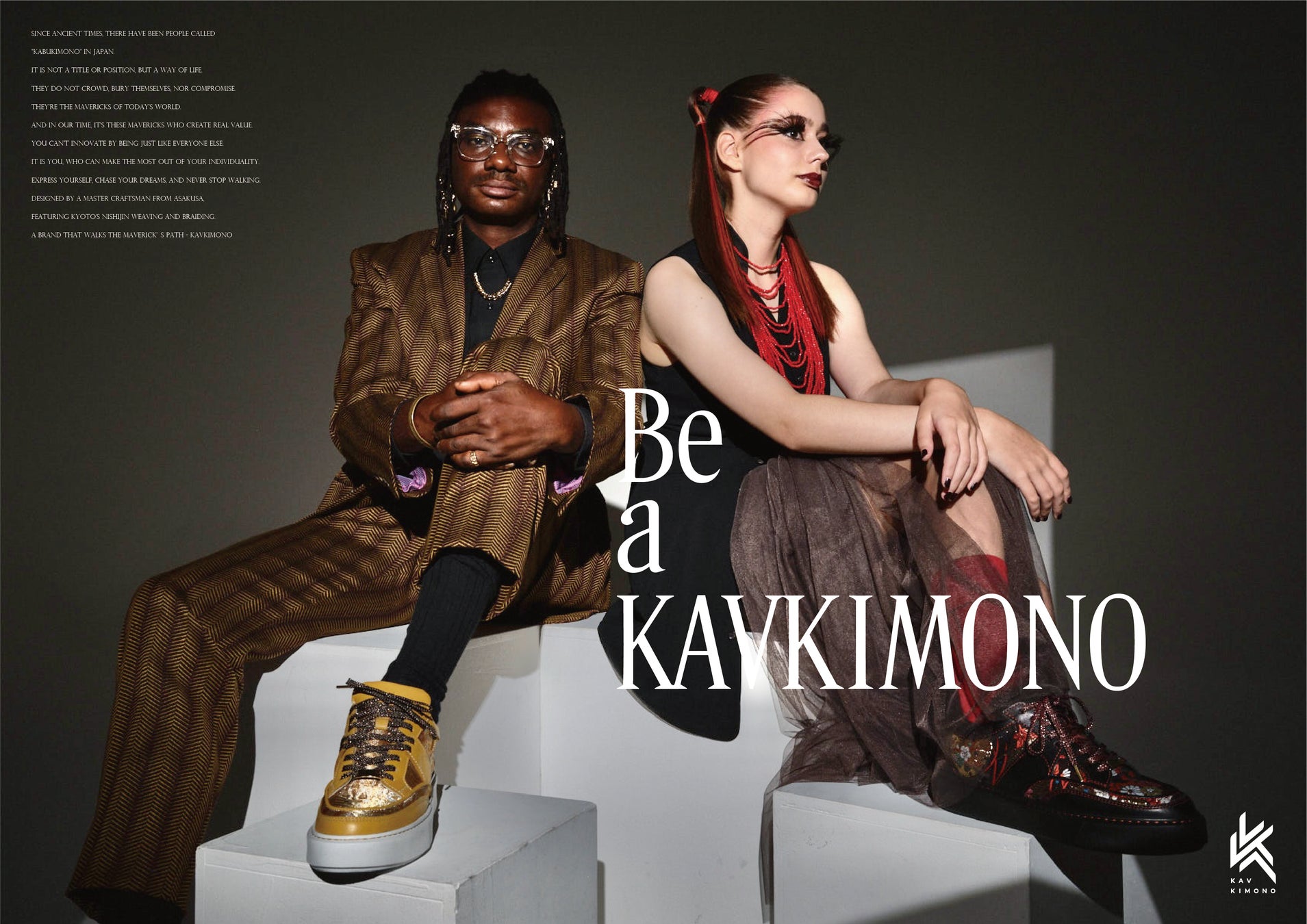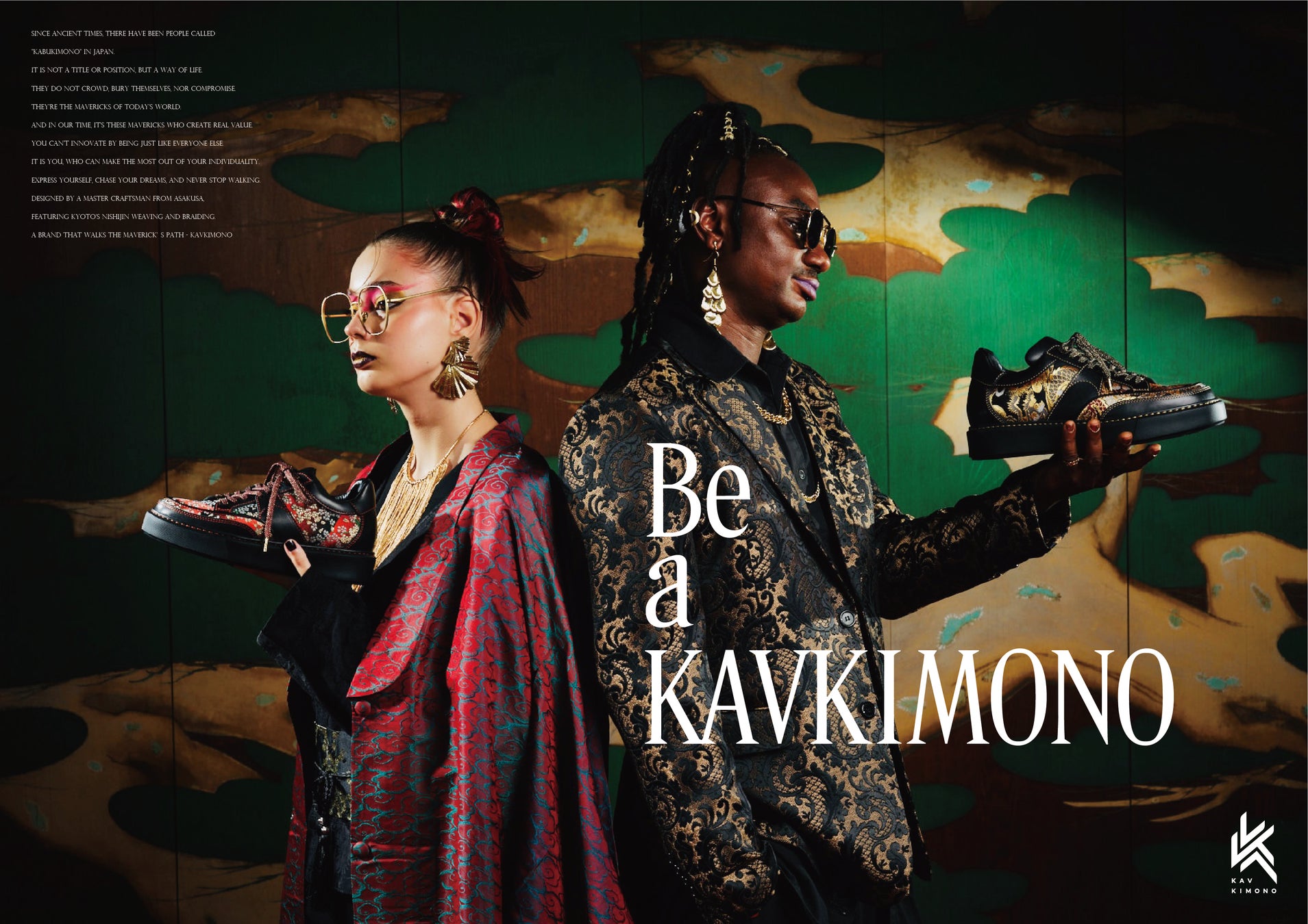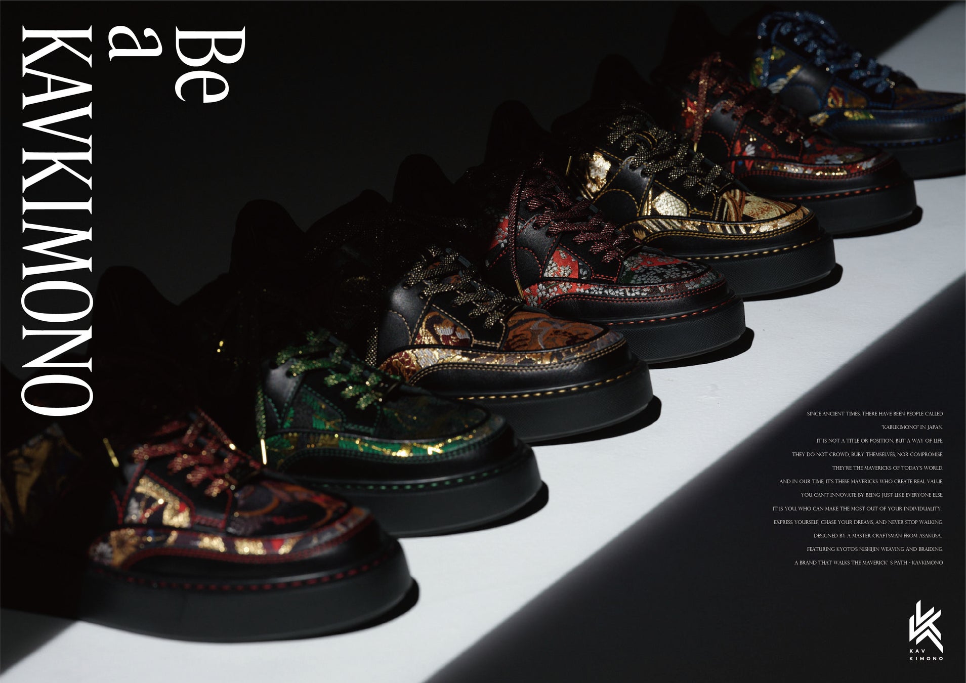 「KAVKIMONO(傾奇者)」は、京都の伝統織物〈西陣織〉と〈組紐〉をまとい、東京・浅草の職人が仕上げる、日本発のラグジュアリースニーカーブランドです。