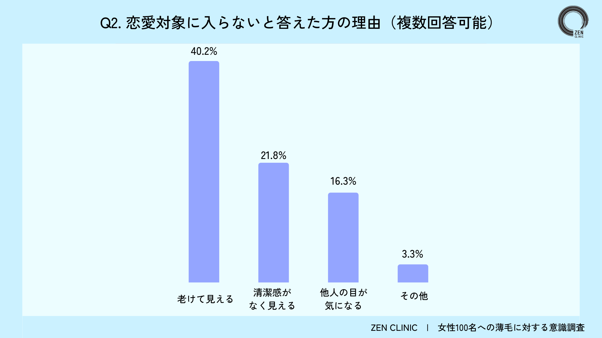 薄毛の男性が恋愛対象に入らないと回答した方の理由のうち、約40%の方は「老けて見えるから」という理由を挙げていました。髪が薄く、髪質などが細くなってきて地肌が見えてしまうと、実年齢よりも老けて見えてしまうというのが大きな理由でしょう。