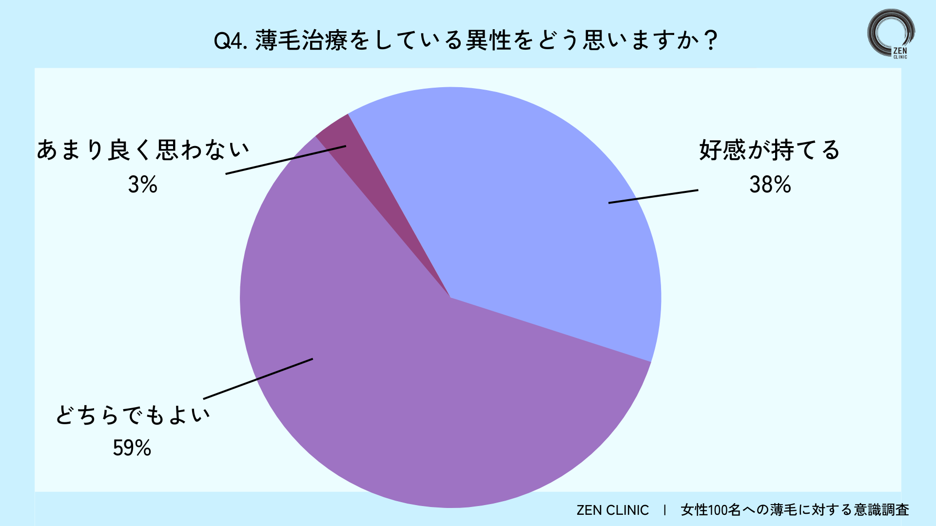 薄毛の男性が治療をしていることに対して「良く思わない」と回答したのは僅か3%と少数でした。全体の中でも「好印象」と答えた方は38%、「どちらでもよい」と答えた方は59%と、薄毛治療をしている男性に対して気になると感じる女性は非常に少ないことがわかります。