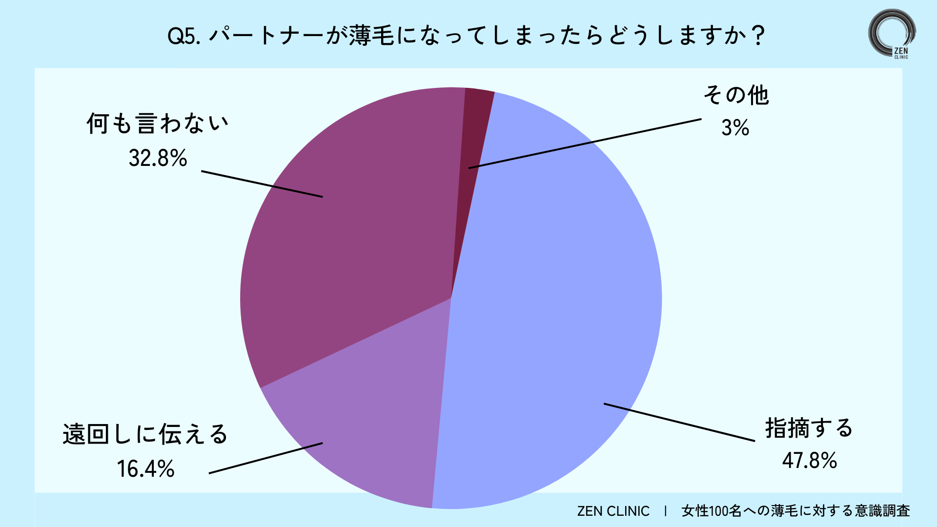 パートナーが薄毛になってしまった場合、約半数の方が「指摘する」と回答、また15%以上の方も「遠回しに伝える」と回答しており、薄毛になってしまった場合パートナーが傷ついてしまわないように伝えるという方が多くいらっしゃいました。