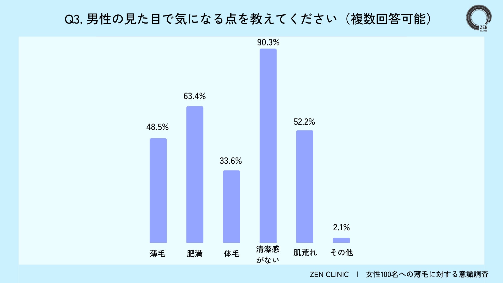 また、「薄毛」も約半数の方が気になると回答しており、「薄毛」であることは「清潔感がなく見えてしまう」というQ2の回答にも関係していることが伺えます。