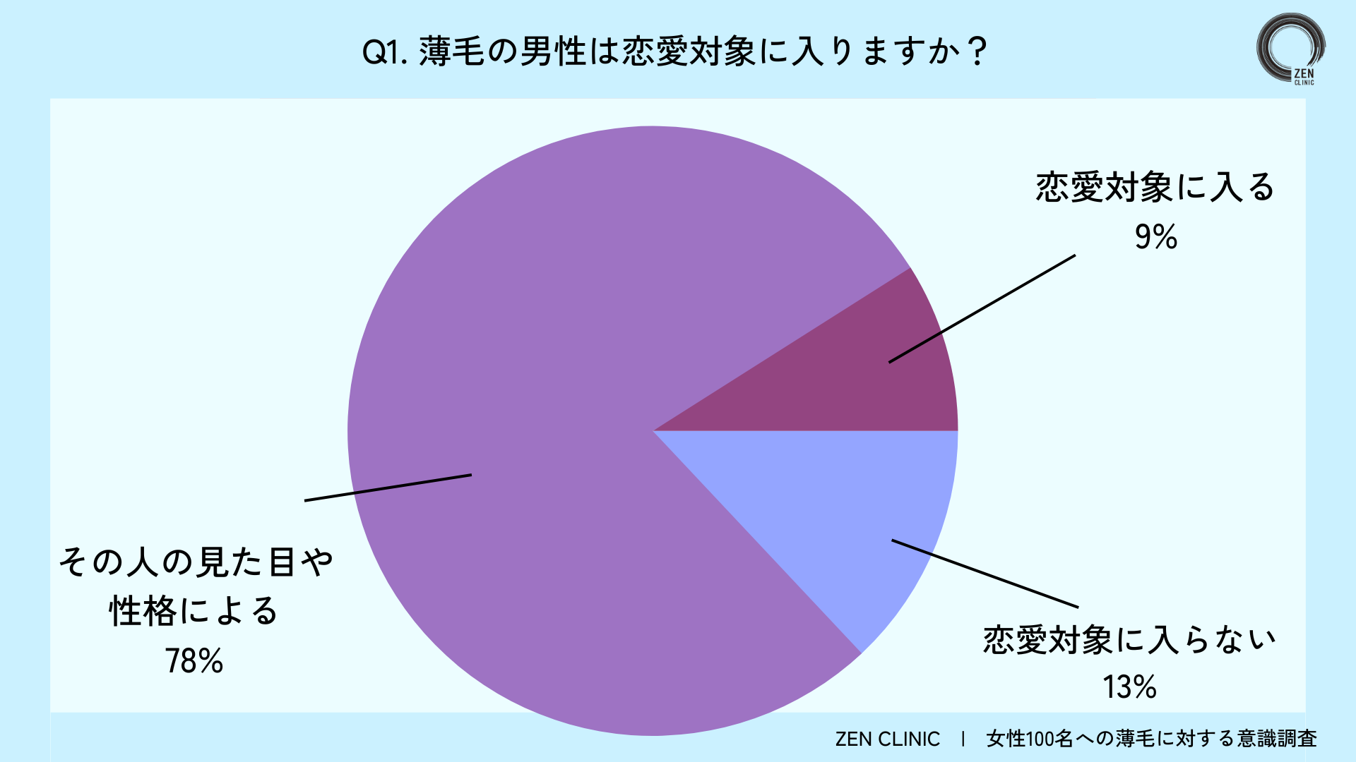 薄毛の男性は恋愛対象に入らないと13%の方が回答。その人の見た目や性格重視という意見が多数