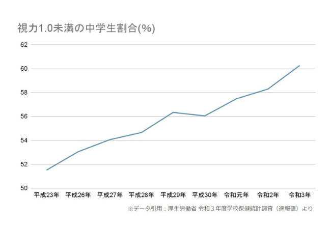 2022年7月に厚生労働省より発表されました、「令和3年度学校保健統計(速報値)」によりますと、中学生の裸眼視力1.0未満の割合は、60.28%と過去最多となりました(下記画像参照)。コロナ禍でスマートフォンによる動画等の視聴や、GIGAスクール構想によるタブレット学習の浸透もあり、こどもの目を取り巻く「近業」(近くを見る作業)の増加が社会課題として存在していると弊社は考えました。その中でも特に、受験に向けて日々長時間にわたり勉強する受験生を「瞳から応援したい」と思い、製品企画いたしました。