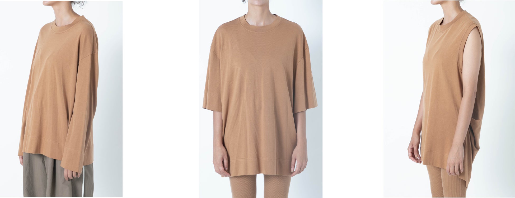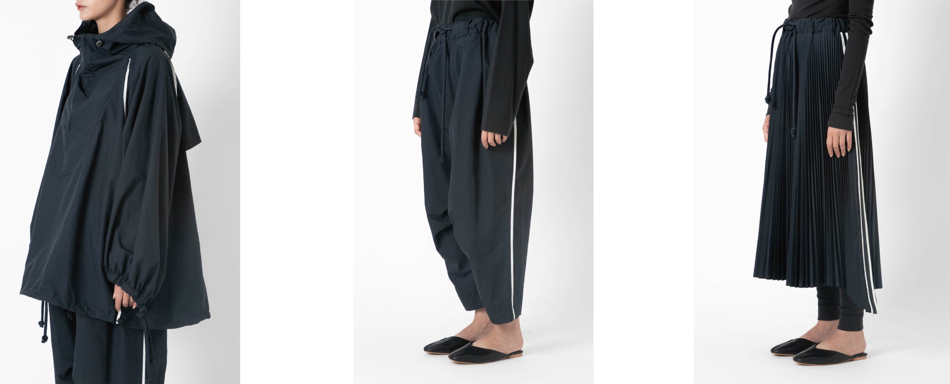 左から順に)Hoodei Tops (FW22)/¥35.200(Tax In), Easy Tucked Pants (FW22)/¥28.600(Tax In), Pleated SK (FW22)/¥33.000(Tax In)