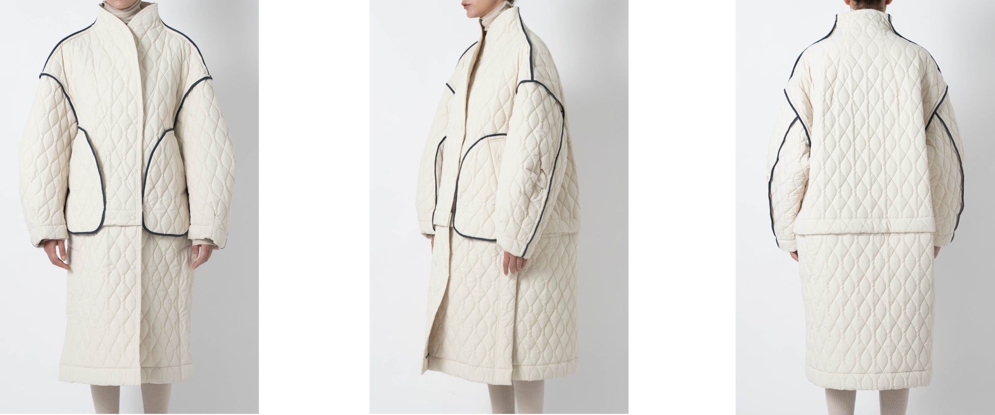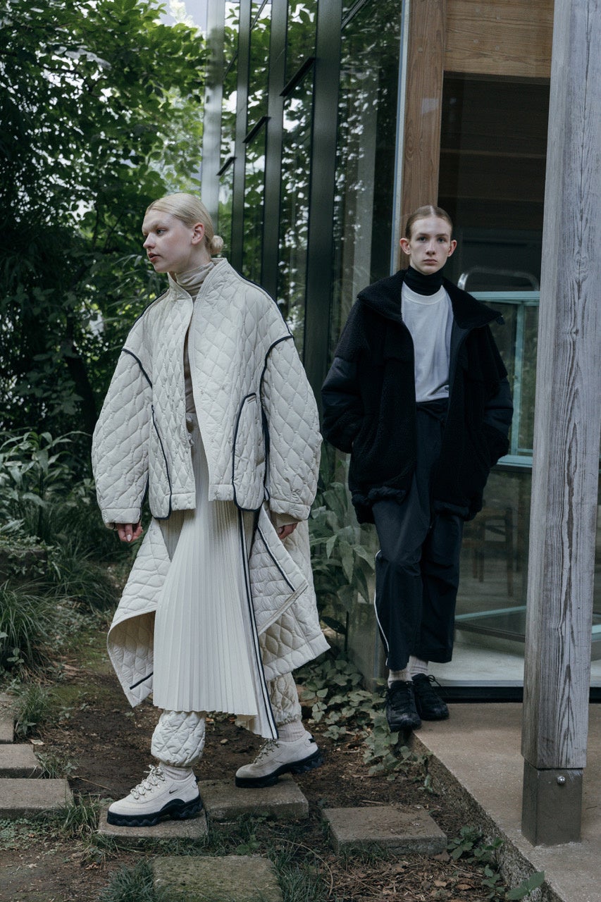 1stシーズンは都会から離れ、軽井沢の高原リゾートで過ごす余韻の時間をテーマに シンサレートのキルティングや中綿コート、プリーツSKやTOPSも撥水加工を施すなど 自然の中でも快適に過ごせるウエアを提案。デザイナーの得意とするパイピングのディテールなどファッション性も楽しめるアイテムを中心に展開する。