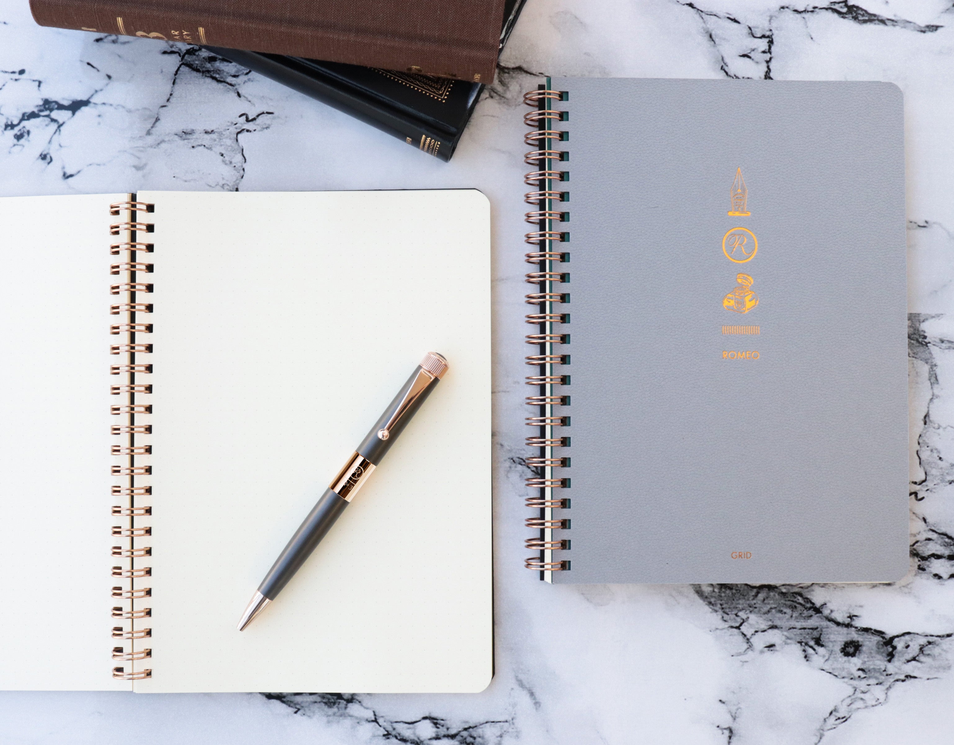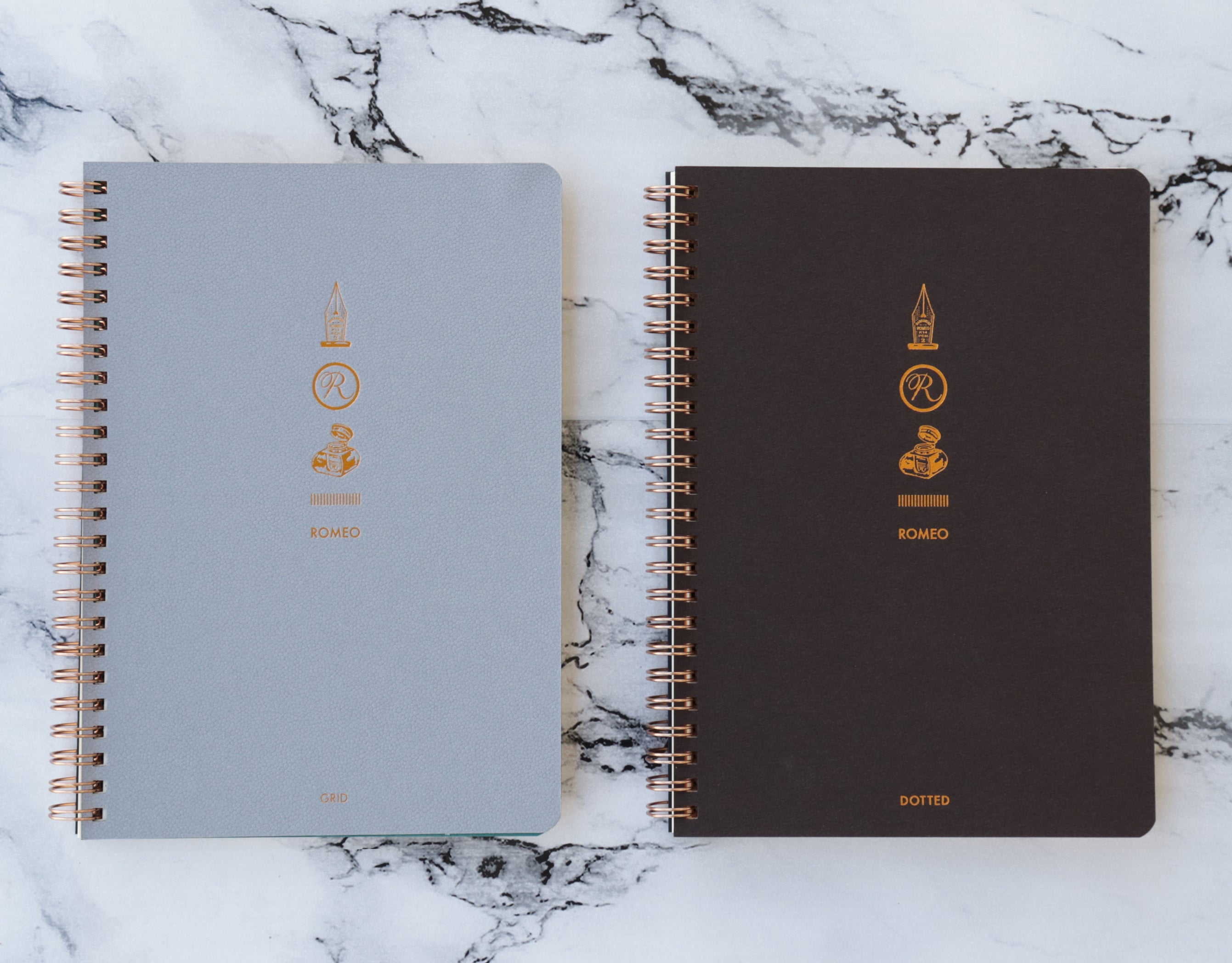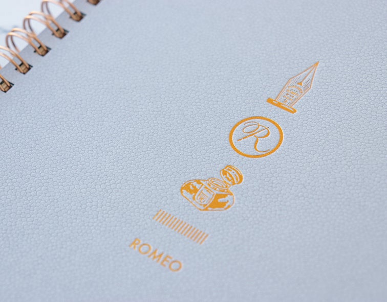 実⽤性と機能美を兼ね備えたROMEO No.3ボールペンの書き⼼地をさらに引き⽴たせるのは、本⾰をイメージした⾼級感のある表紙にカッパーカラーのリングと精緻な箔プリントが上品な輝きを放つ「ROMEO Wリングノート」。筆記⽤に開発された⽤紙のなめらかさには、紙によってこんなにも書き⼼地が変わるのかと驚かされることでしょう。上品な雰囲気のグレーとブラウンの表紙は、伊東屋限定カラー。ビジネスアイテムとしても使いやすいA5サイズで、グレーの表紙は図形や表を書きやすい⽅眼罫、ブラウンの表紙は様々なレイアウトで使⽤できる⾃由度の⾼いドット罫を採⽤しています。
