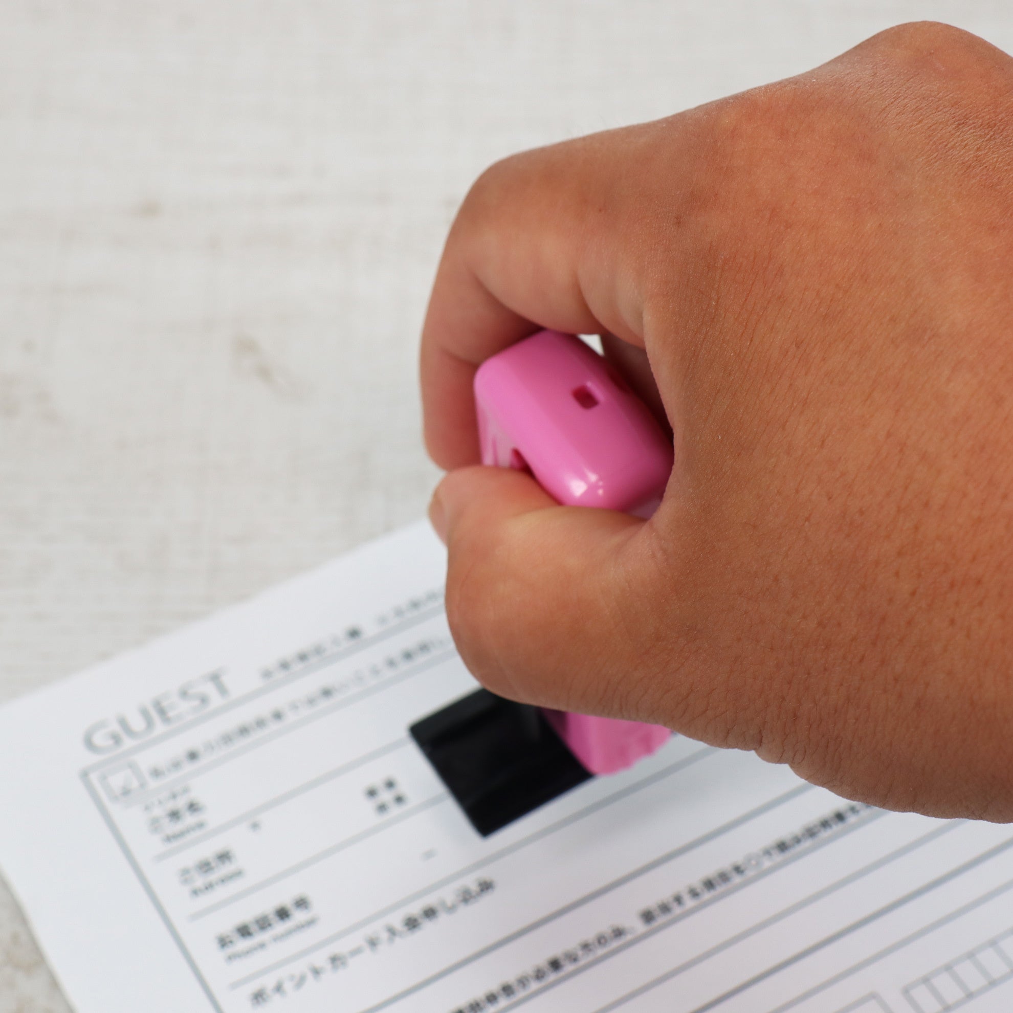 住所や名前のスタンプをお持ちの方はたくさんいらっしゃると思いますが、その多くは持ち運べないスタンプ台が必要なタイプです。「らくぽん」はキャップレス(取り外し無し)で操作もワンタッチ、その上折り畳み式なのでポケットに入れて持ち歩けるので便利です。「らくぽん」があればもう書くことも並ぶともなく”ノンストレスで”チェックインを済ませるとが出来ます。