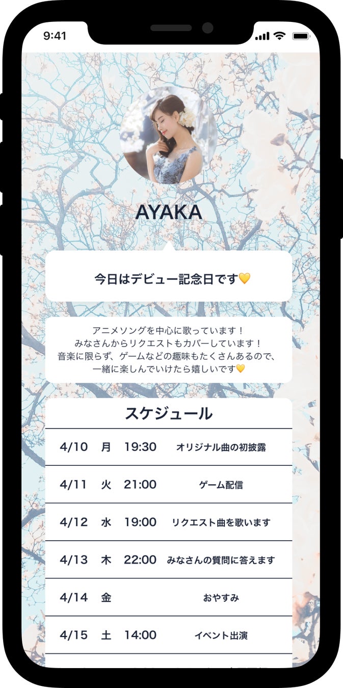 活動プラットフォームをまとめて掲載する機能に加えて、カレンダー機能で配信やイベントのスケジュールも一つにまとめて日々の活動をファンに共有することができます。