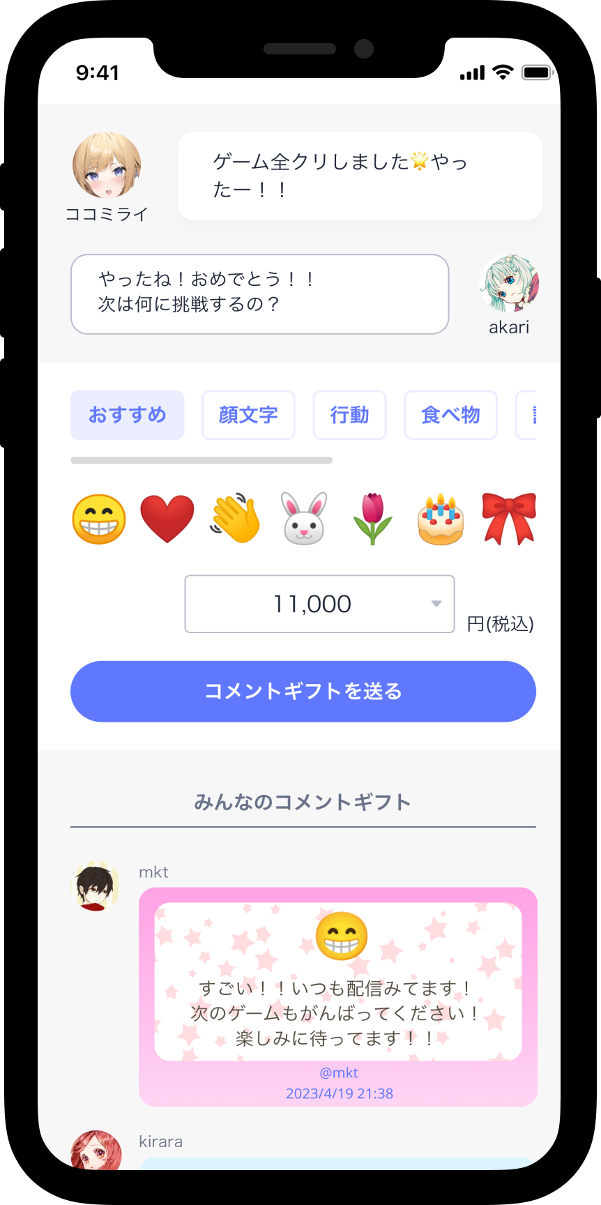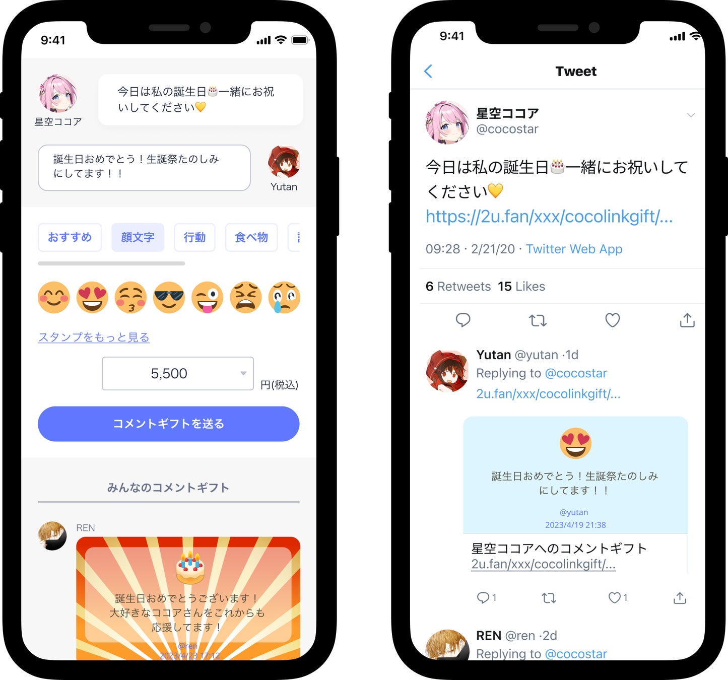 みんなの気持ちを形にする「コメントギフト」機能で日々の活動を応援してもらうだけでなく、Twitter投稿を通じた収益化も可能です。