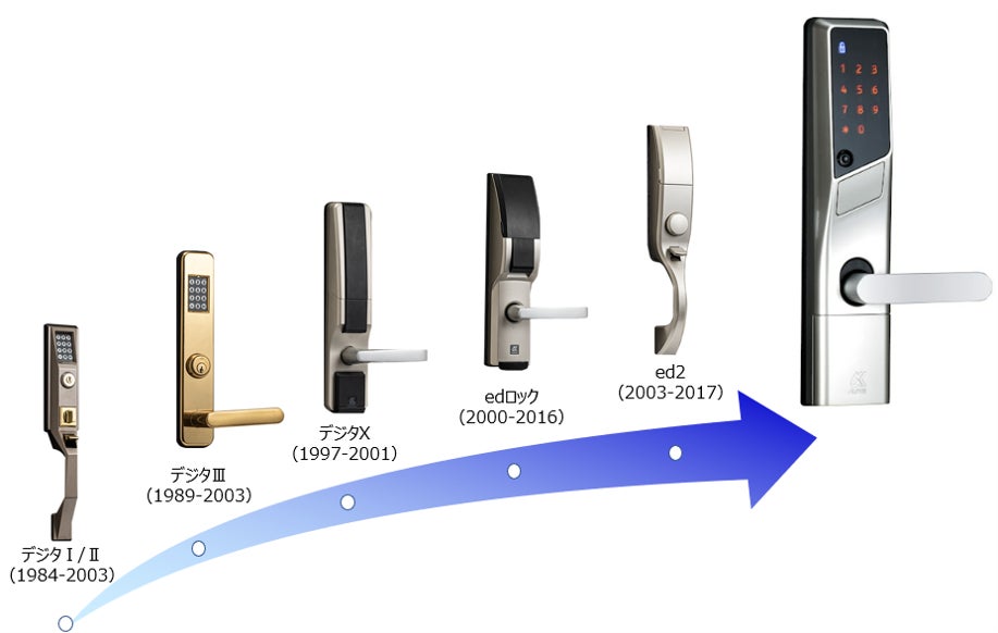 「edロックシリーズ」 は、1984年にキーレス玄関錠 「デジタロック」 の製造・販売開始から30数年間、時代と共に進化して参りました。現在、7代目の「edロック PLUS」 はデザイン性が高く、多様な認証方式に対応したシンプルでスマートな高機能電気錠です。簡単な操作で玄関ドアの施錠・解錠が行え、暗証番号・ICカード・おサイフケータイ・シールキーに対応しています。