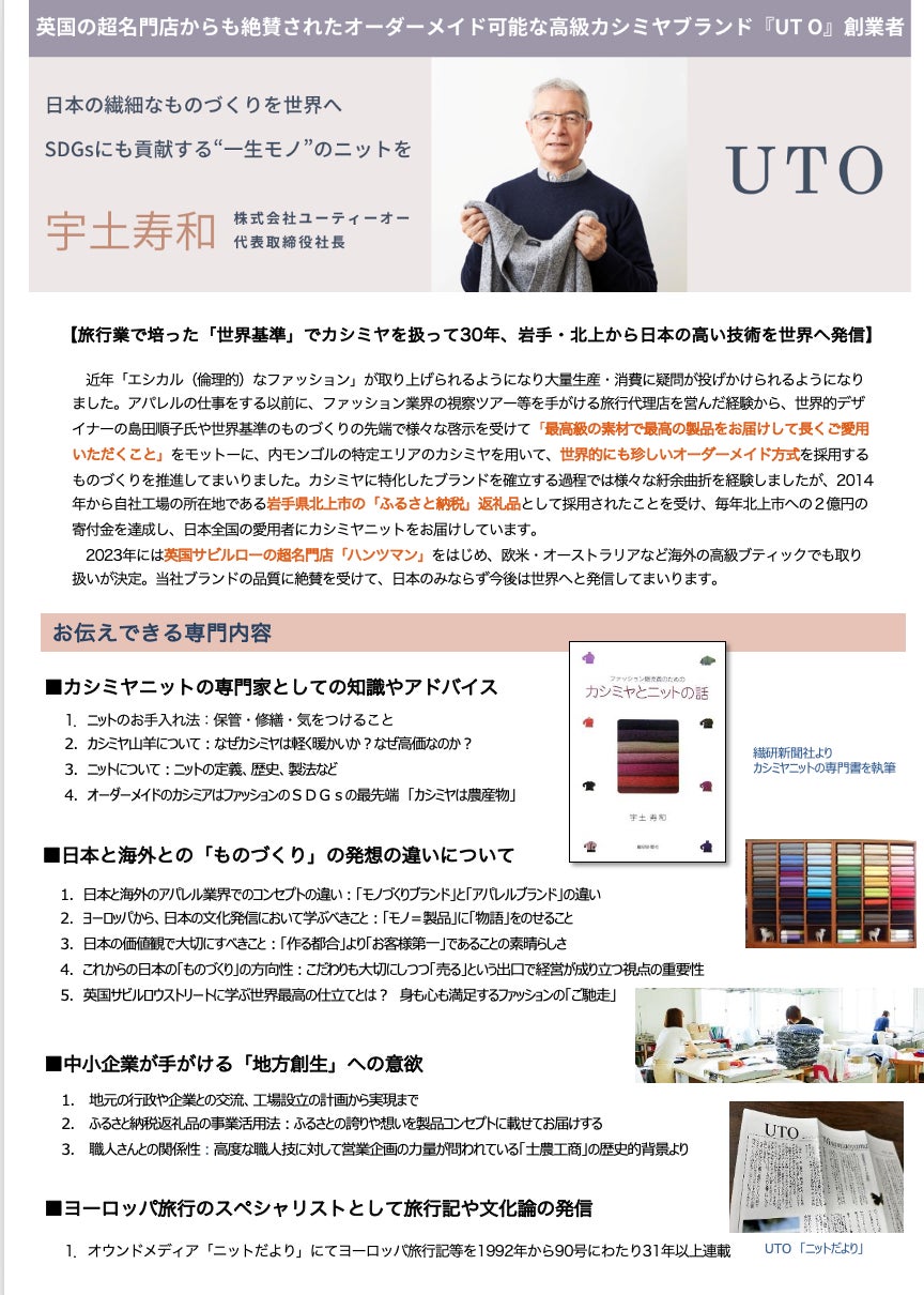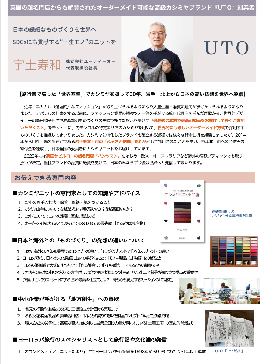 当社社長の目標は「世界一」。世界中の人に「カシミヤと言えばUTO」「岩手県北上市はカシミヤの聖地」と知ってもらうこと。
