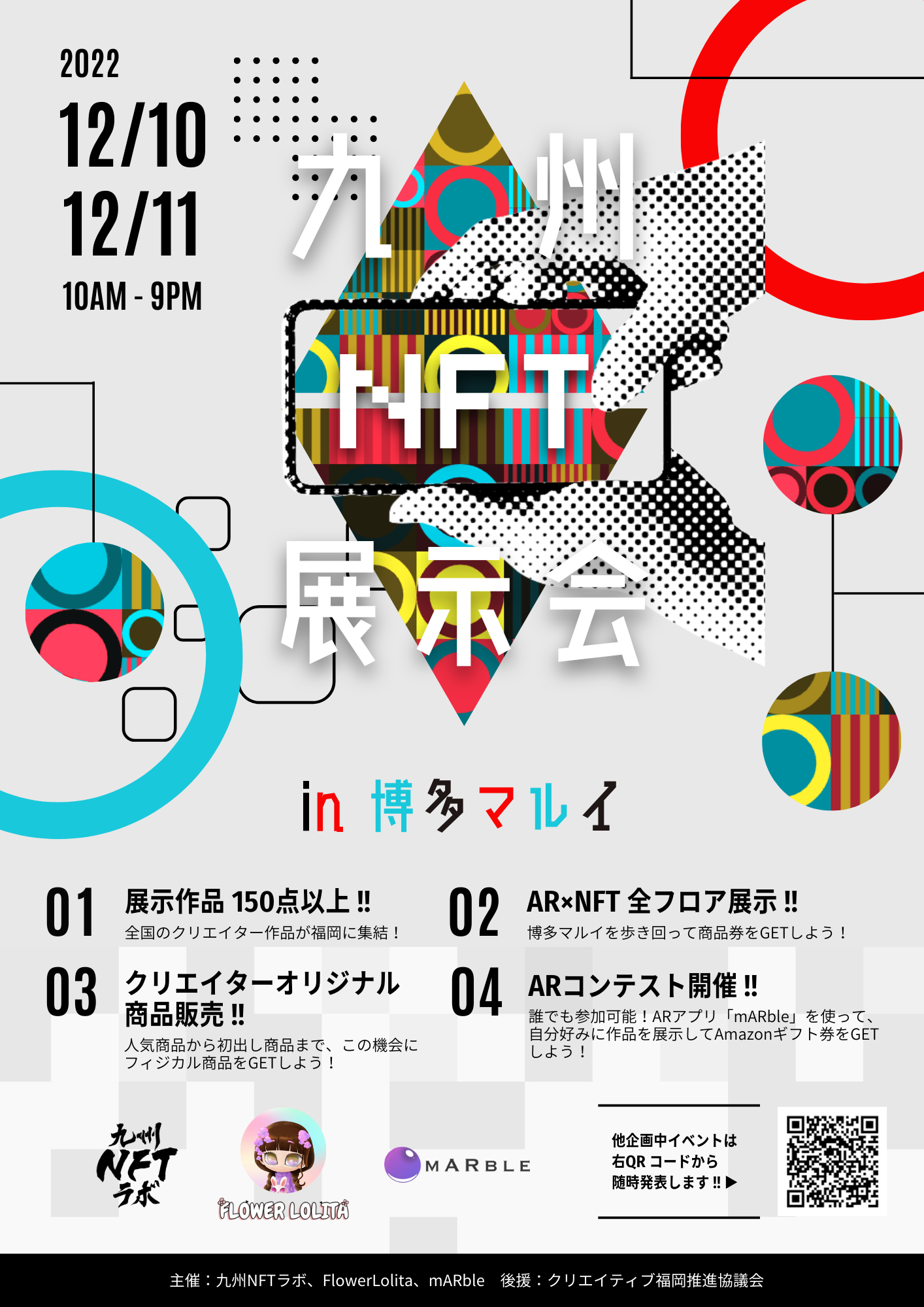 九州NFTラボは、2022年12月10~11日、本田圭佑氏も参画する日本有数のNFTプロジェクト「Flower Lolita」を運営する「株式会社 N3」及びARアプリ「mARble」を開発する「MarbleXR株式会社」と共に、「九州NFT展示会in博多マルイ」を開催します。