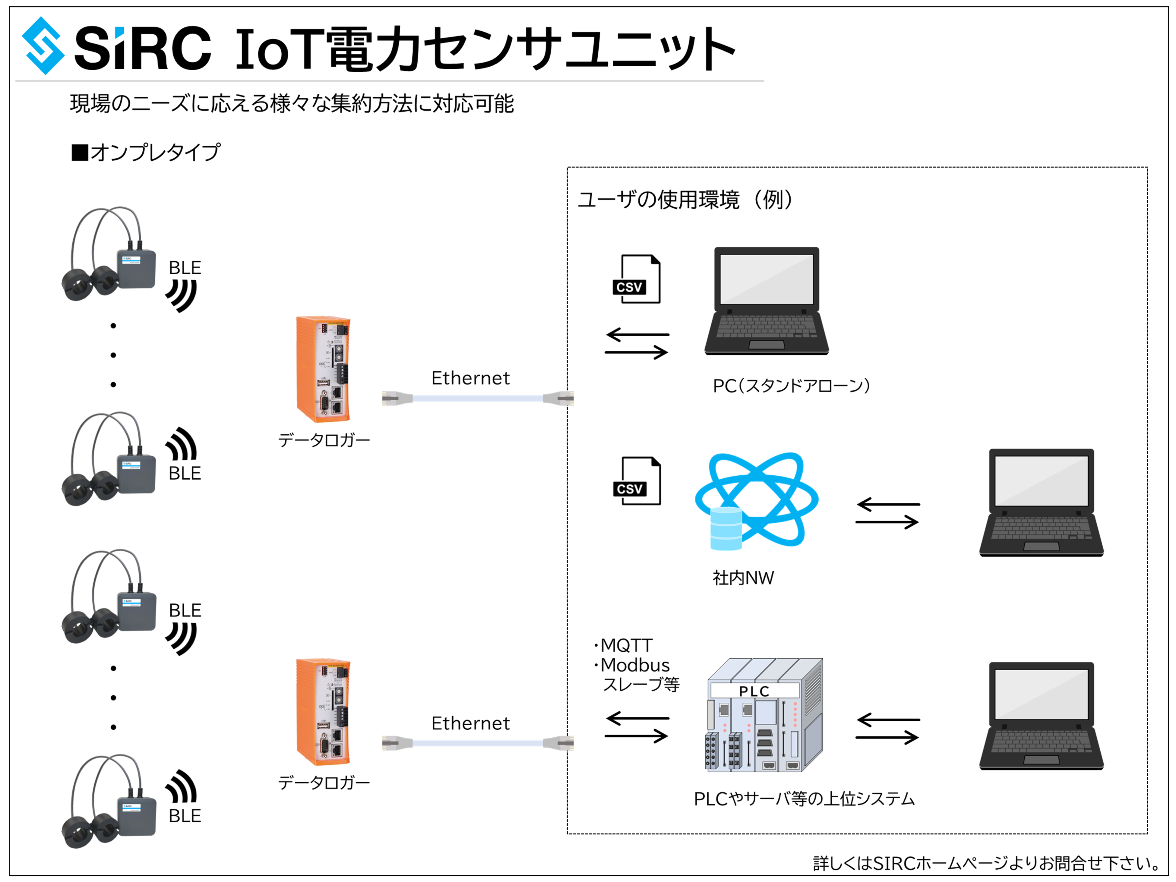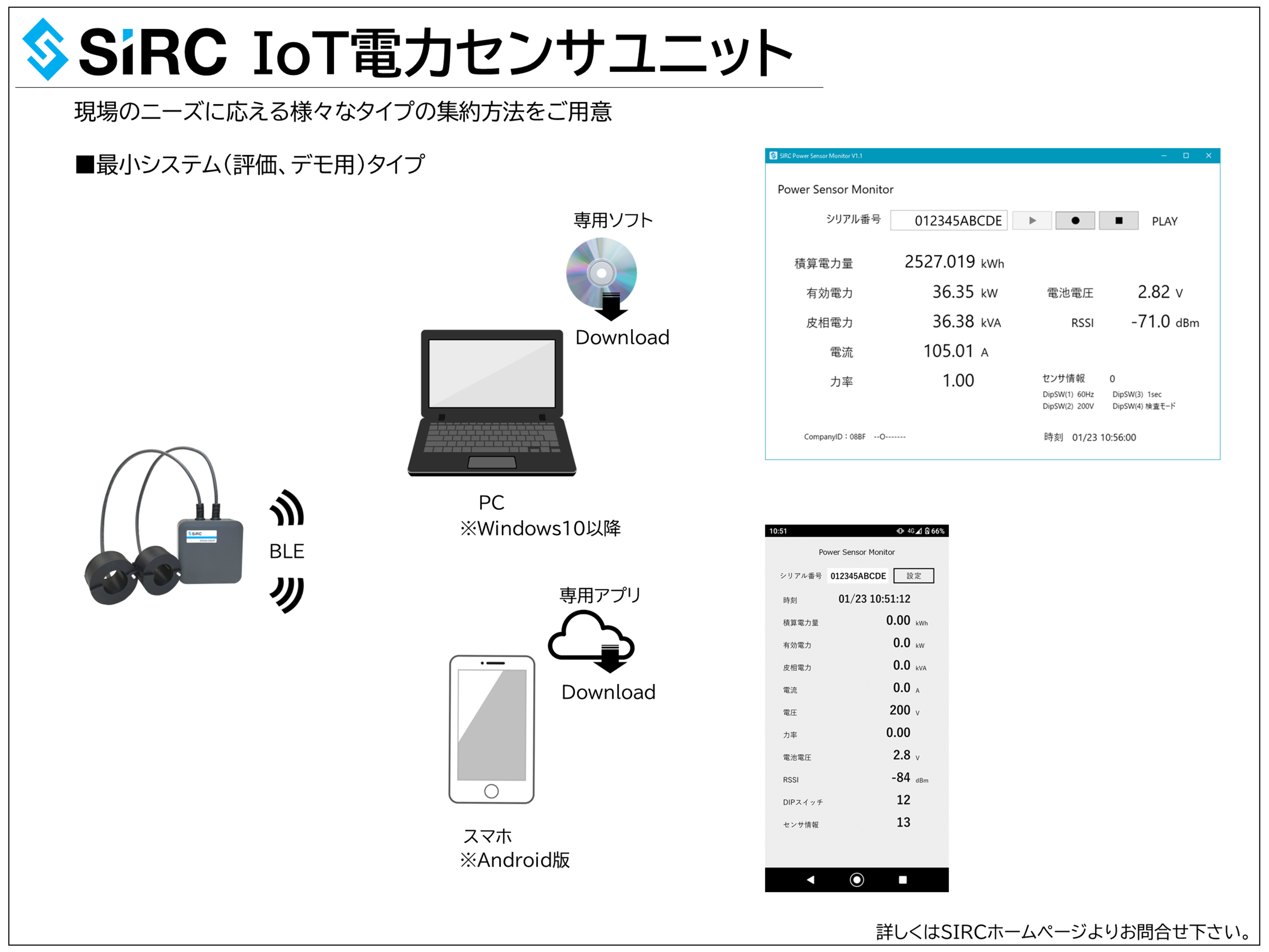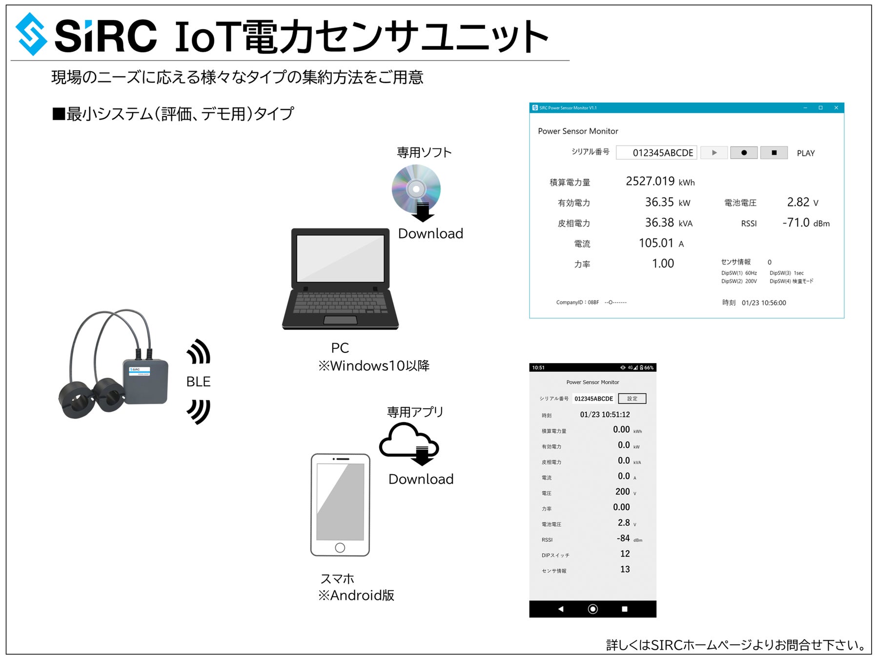 この「SIRC IoT電力センサユニット」で取得したセンサデータの集約を容易に実現するのが、今回リリースします「クラウドタイプ」「オンプレタイプ」、スマホでセンサデータを可視化する「最小システム」などの様々なソリューションシステムとなります。