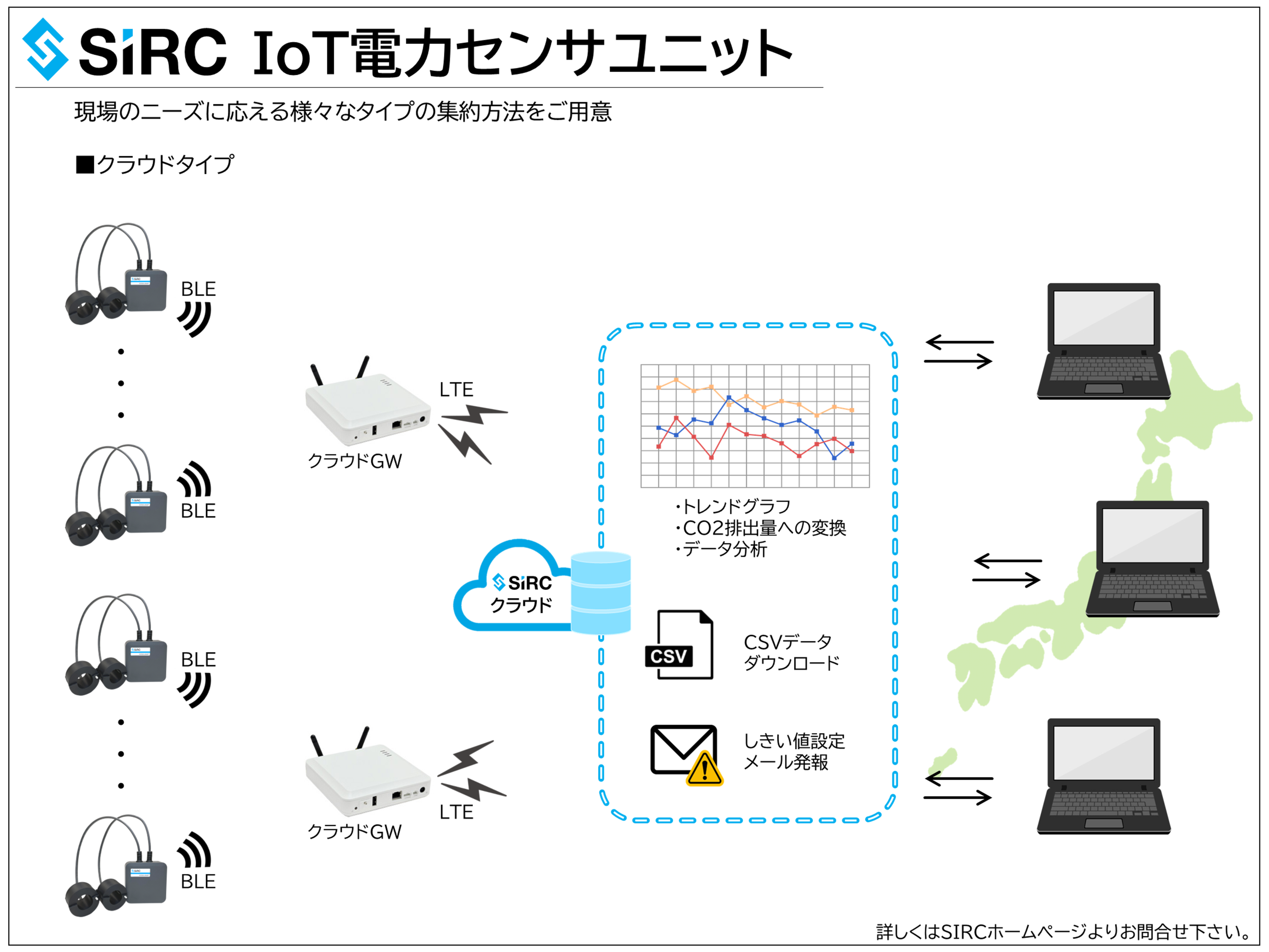 株式会社SIRCでは「IoT電力センサユニット」を活用し、「電力の見える化」を容易に実現する為のデータ集約サービスをリリース致します。
