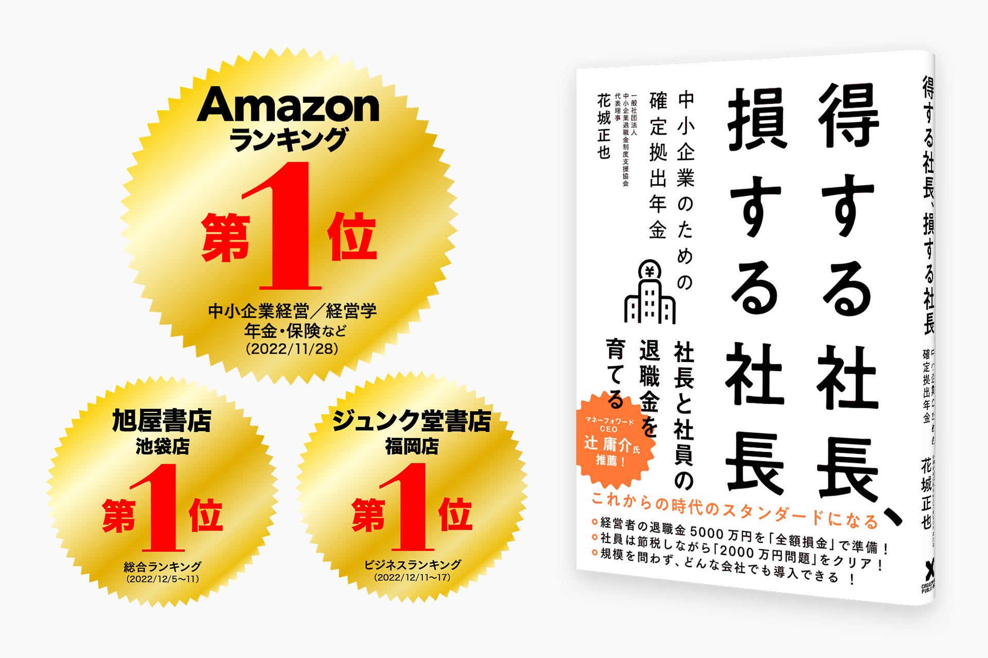 一般社団法人中小企業退職金制度支援協会(福岡市、以下、当協会)は、代表理事 花城正也の著書『得する社⻑、損する社⻑ 中⼩企業のための確定拠出年⾦』(以下、本書)が、Amazonランキングの9カテゴリーで1位を記録(※1)し、旭屋書店池袋店、ジュンク堂福岡店でも販売数1位(※2)を獲得したことをお知らせします。