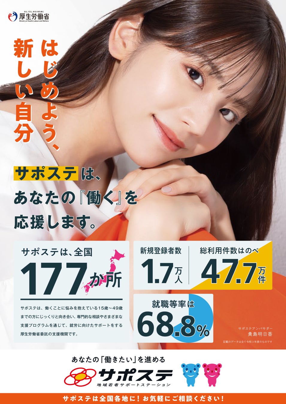 若者等の就労支援事業「地域若者サポートステーション(通称:サポステ)」(厚生労働省委託事業)は、モデルでタレントの貴島明日香さんを「サポステアンバサダー」に起用し、「サポステ」WEBサイトをリニューアルしました。これに合わせて、貴島さんがサポステの活用方法を分かりやすく解説するWEB動画「サポステを知ろう~あなたの「働く」を貴島明日香が応援します!」を12月16日に公開します(予定)。