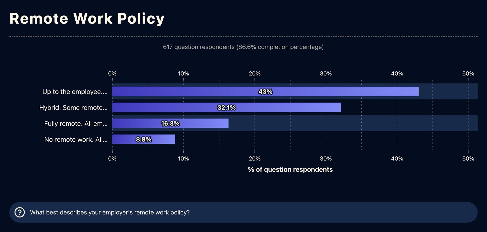 リモートワークが減少傾向。昨年は回答者の70%が完全リモートワークだったのに対し、今年は59%に