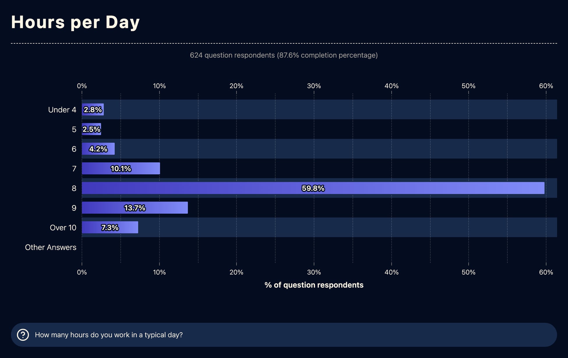79.4%の回答者が平均的な1日の勤務時間は8時間以下と回答。