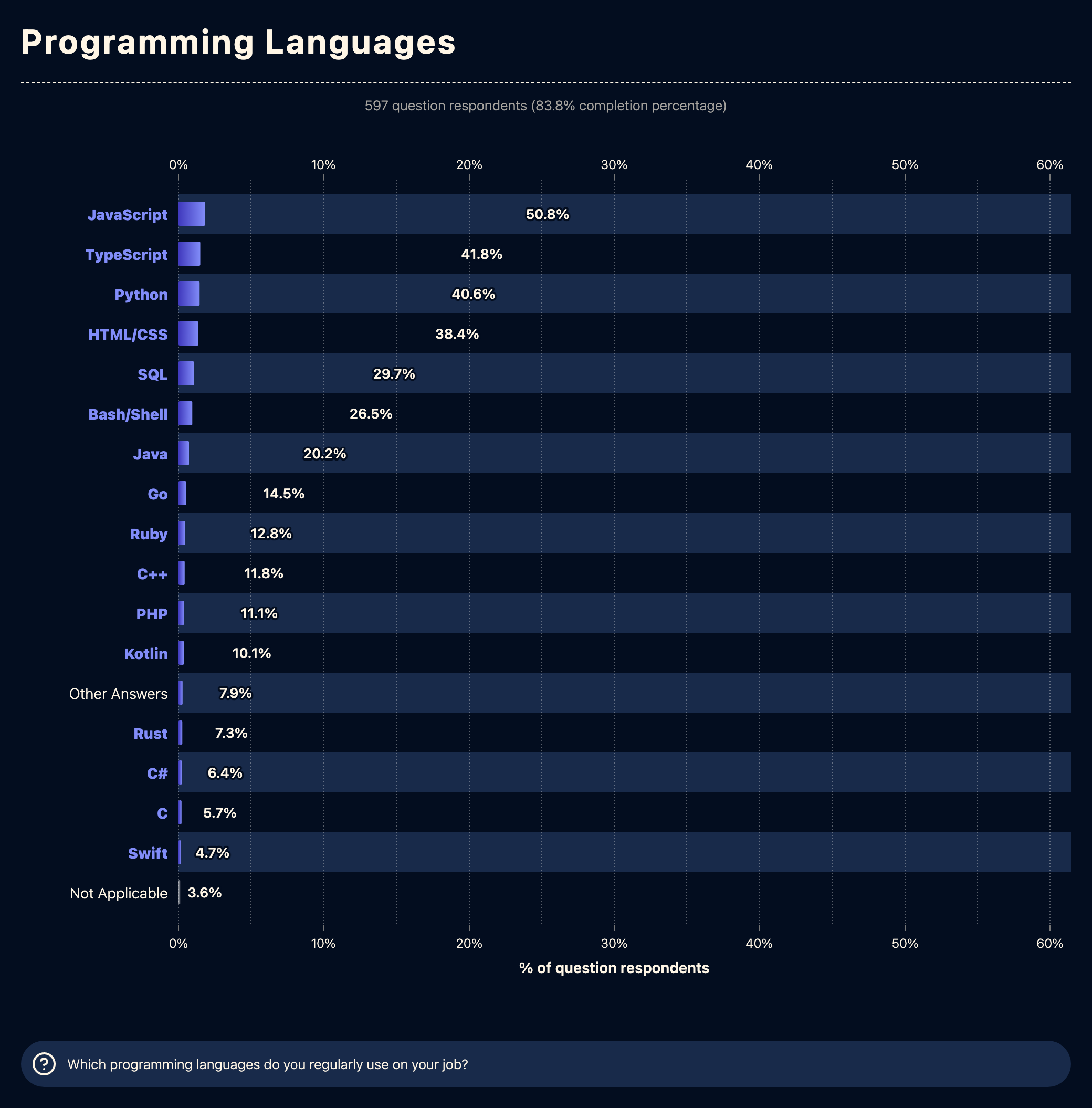 プログラミング言語では、TypeScriptの使用が昨年の33%から42%に急増。JavaScriptに次いで2位に
